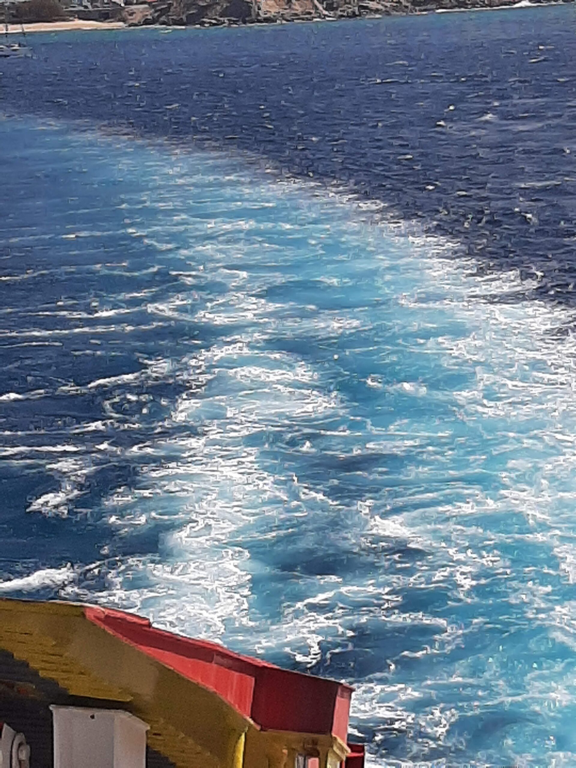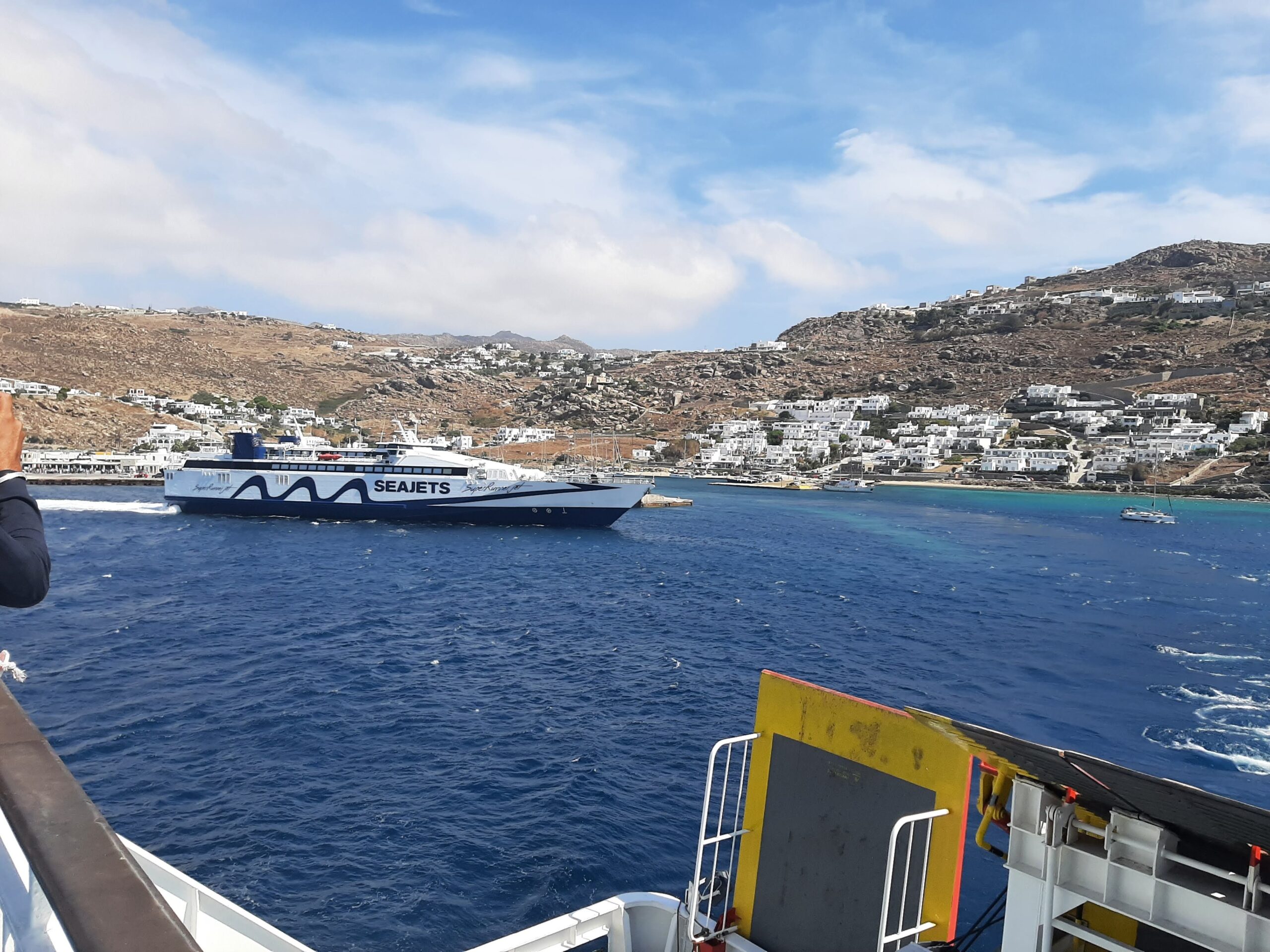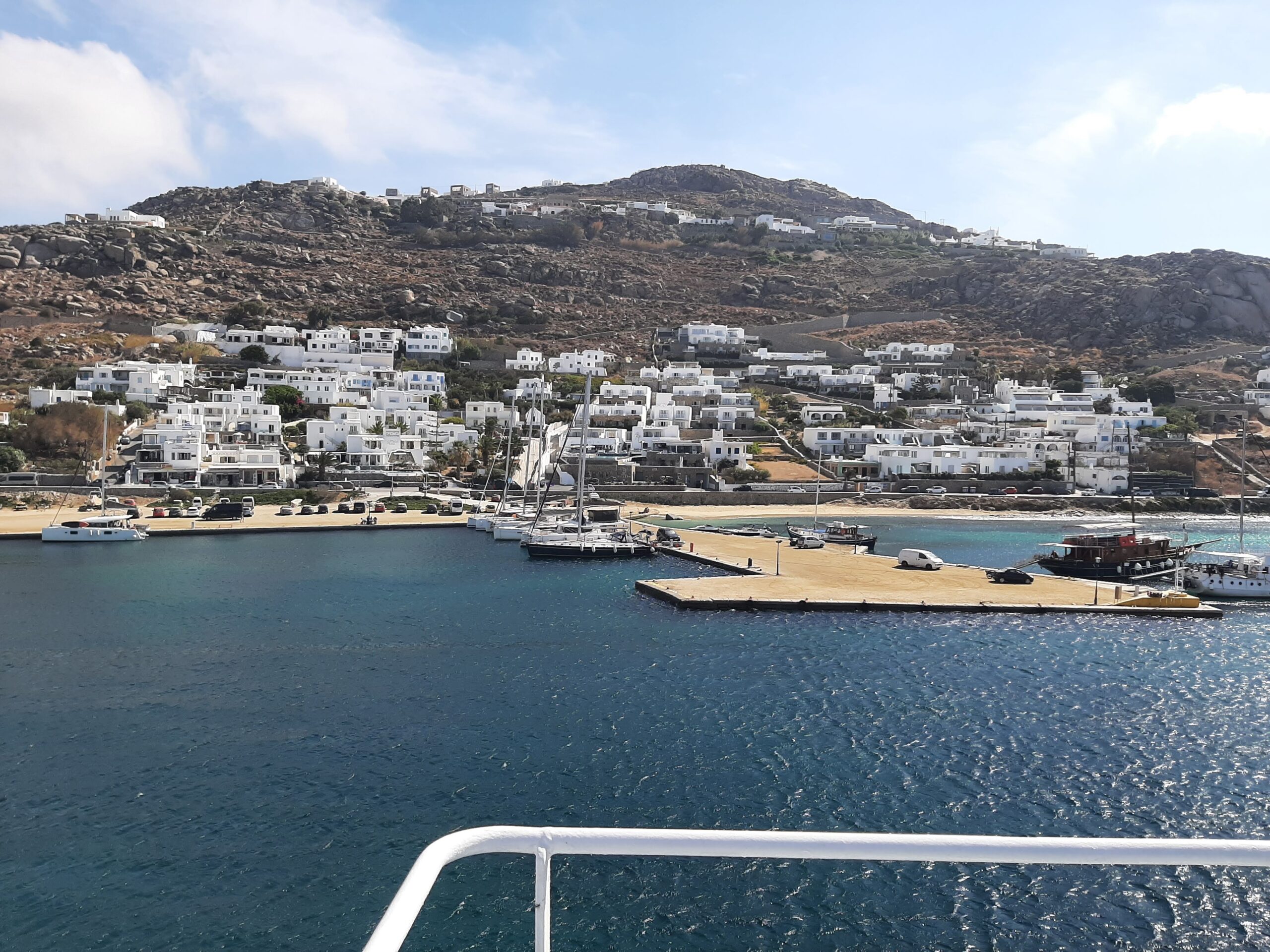 Today is a travel day leaving the Cyclades Islands for the Greek mainland. After being awoken by noisy neighbours returning from a long night in the town, we then had broken sleep until we got up at 8:00. We had a transfer to the port booked for 10:45 for the 12:00 ferry to Rafina. We had a coffee at the cafe next to our hotel while we were waiting, actually we had two, cost 20€ ($33.50 or $8.37 each). Combined with our port transfer fee of 35€, we had spent nearly $100AUD before the day had begun !! The joys of travelling !