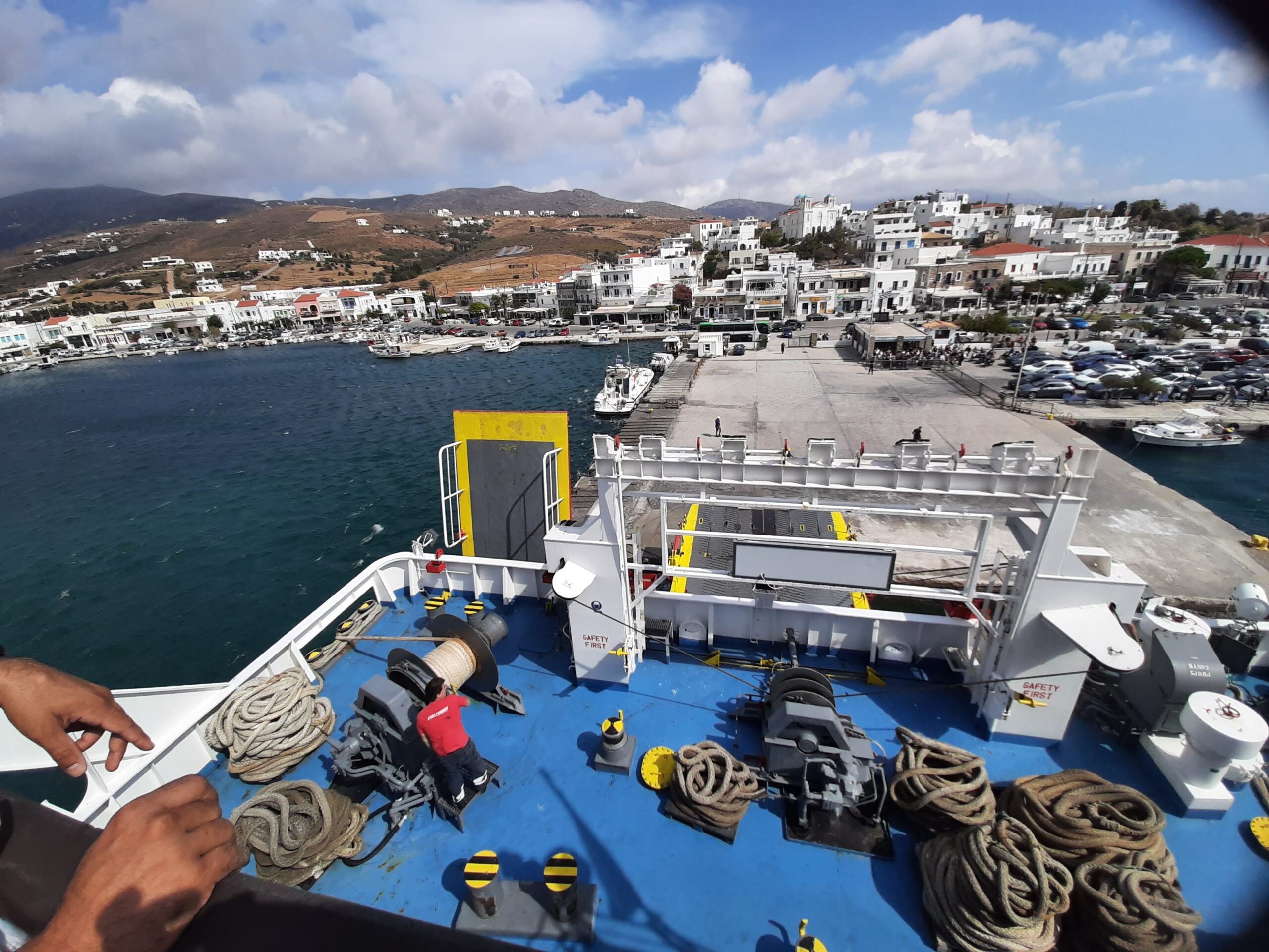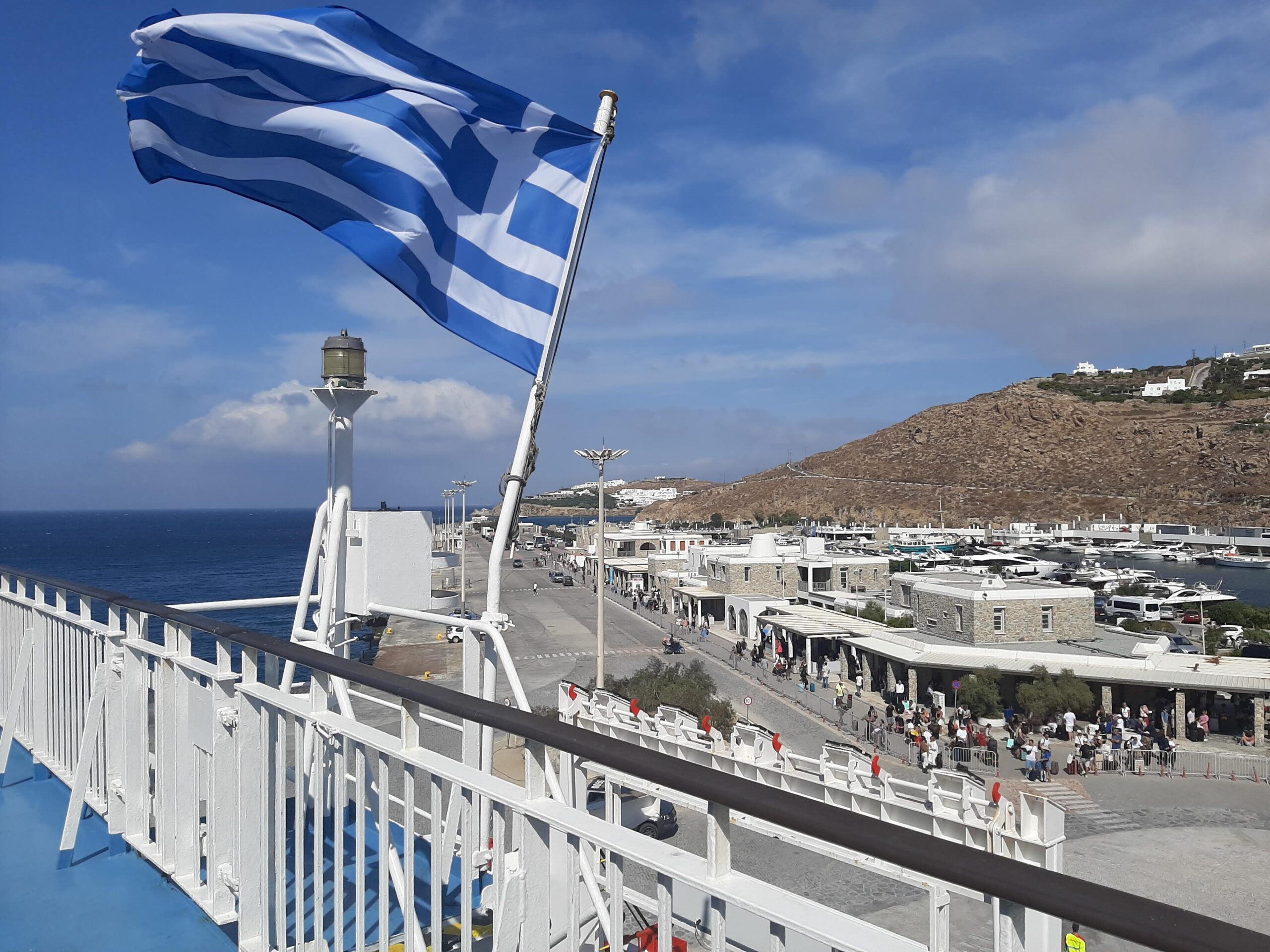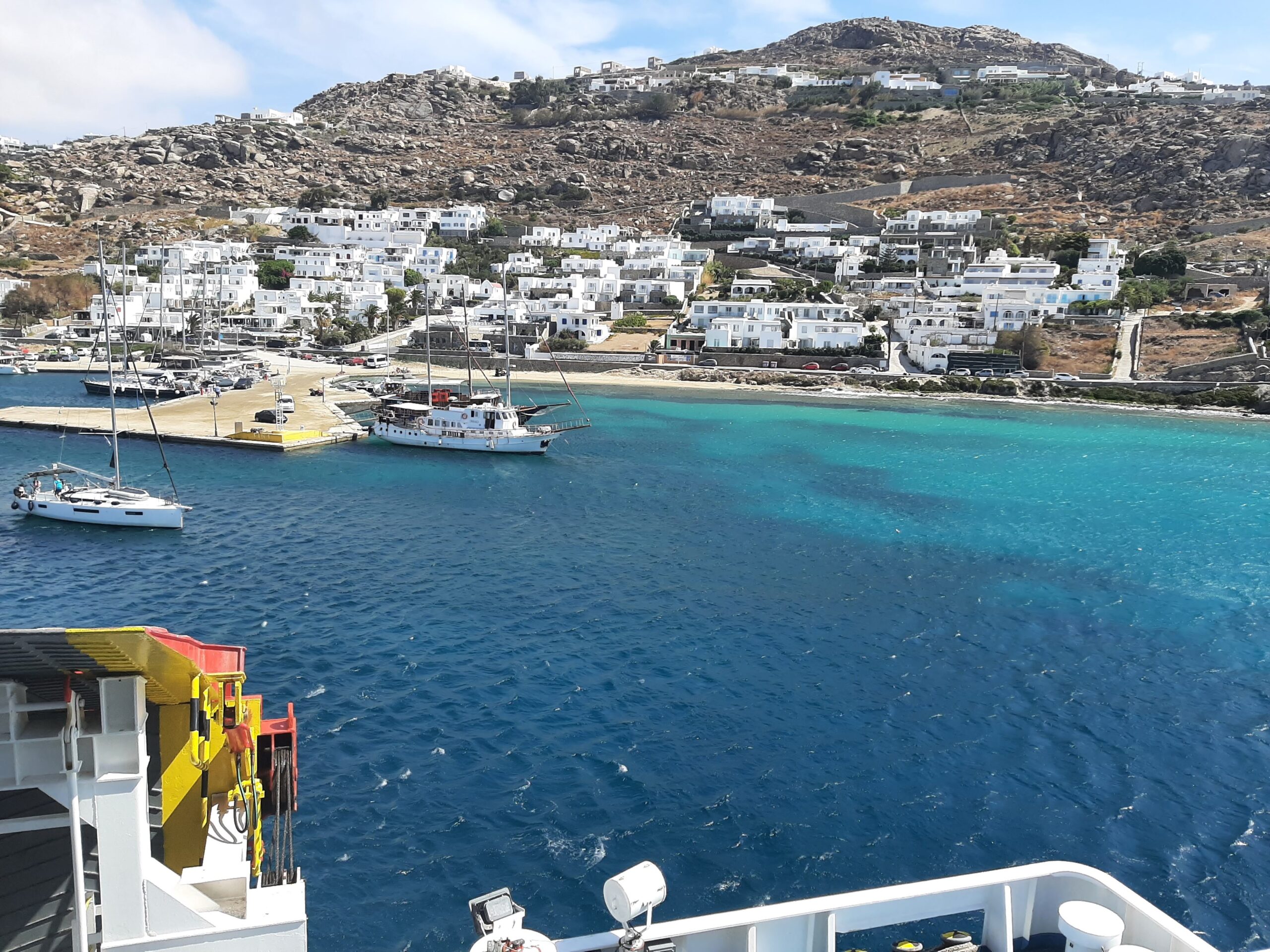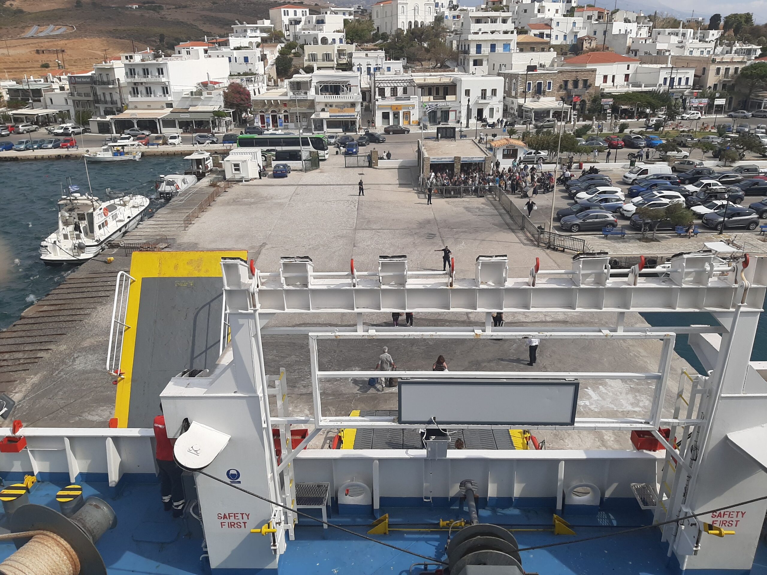 Today is a travel day leaving the Cyclades Islands for the Greek mainland. After being awoken by noisy neighbours returning from a long night in the town, we then had broken sleep until we got up at 8:00. We had a transfer to the port booked for 10:45 for the 12:00 ferry to Rafina. We had a coffee at the cafe next to our hotel while we were waiting, actually we had two, cost 20€ ($33.50 or $8.37 each). Combined with our port transfer fee of 35€, we had spent nearly $100AUD before the day had begun !! The joys of travelling !