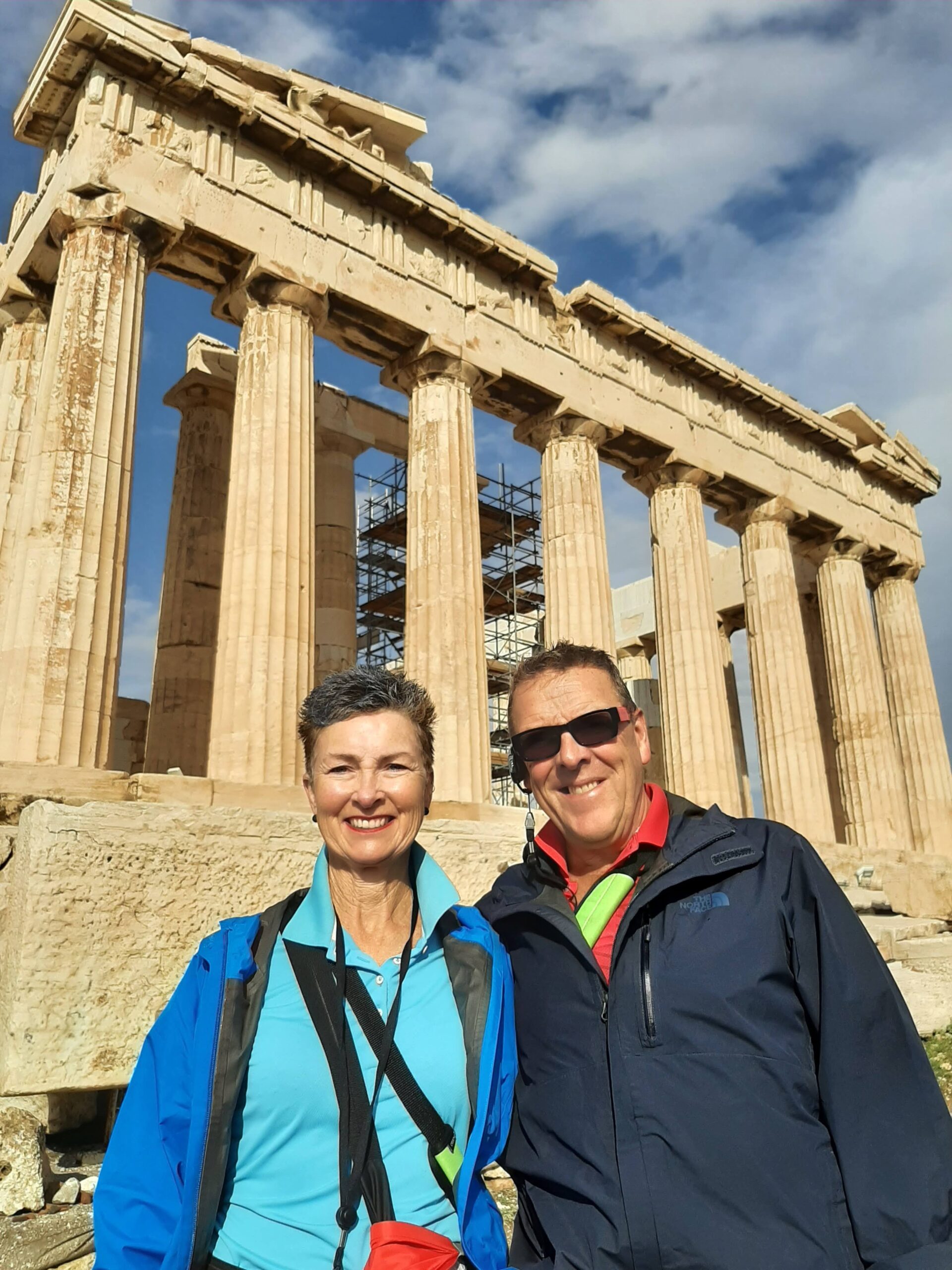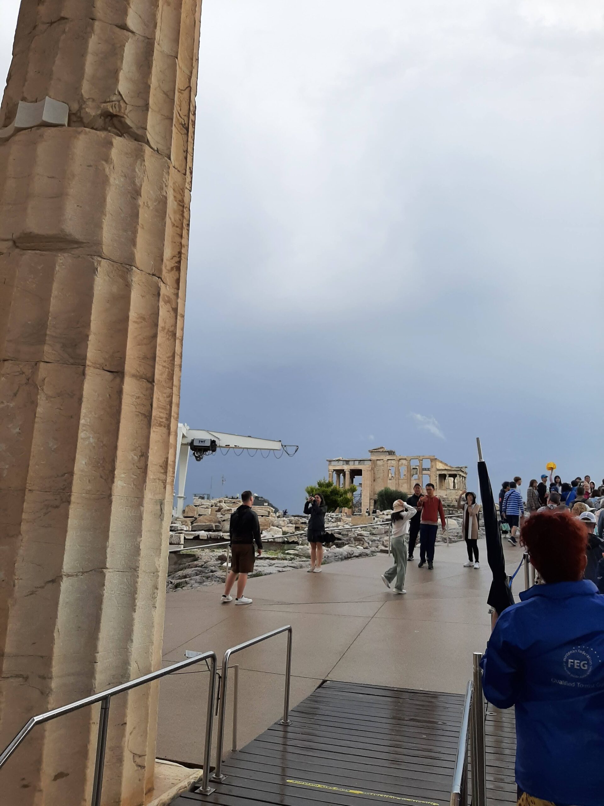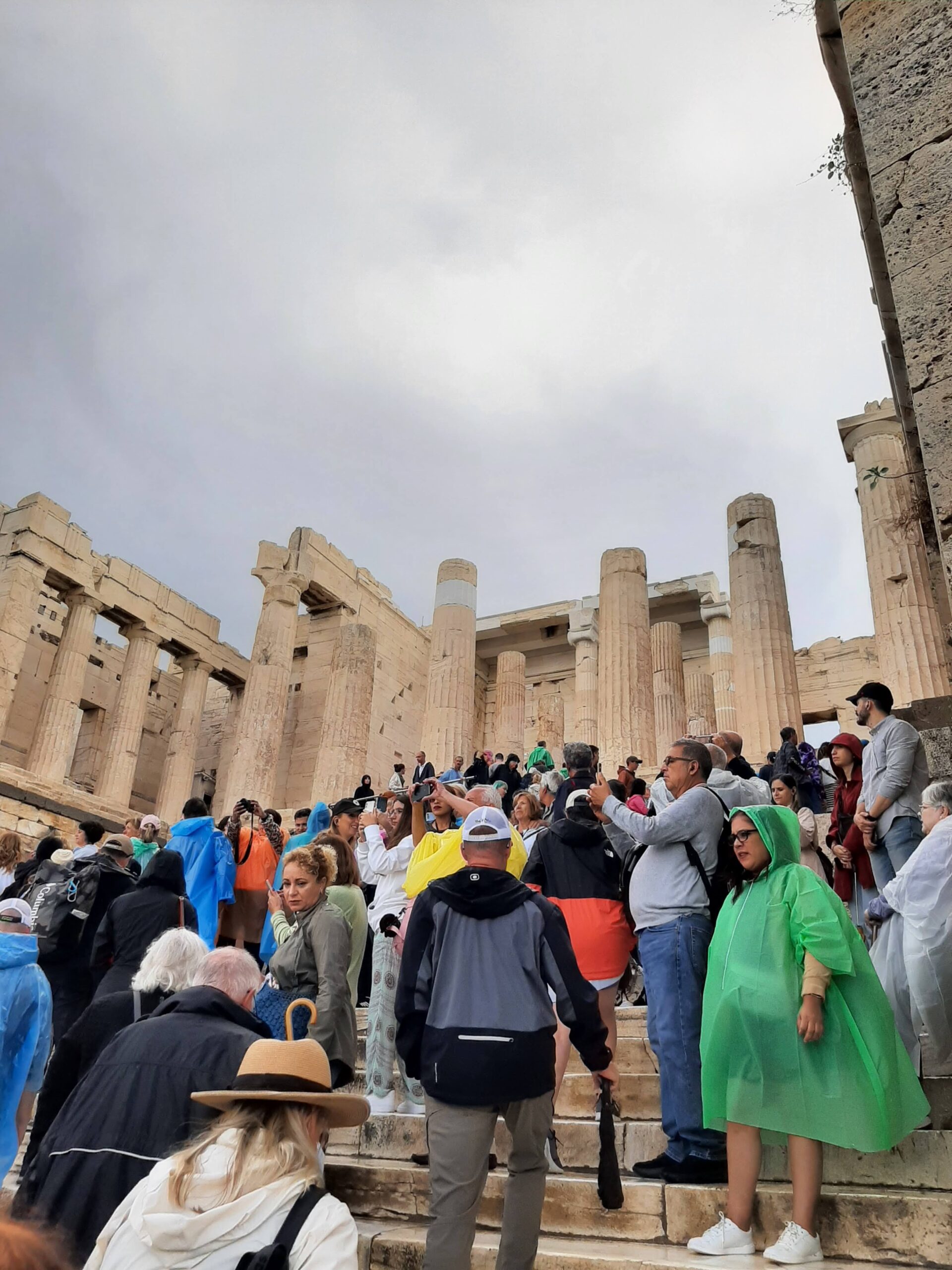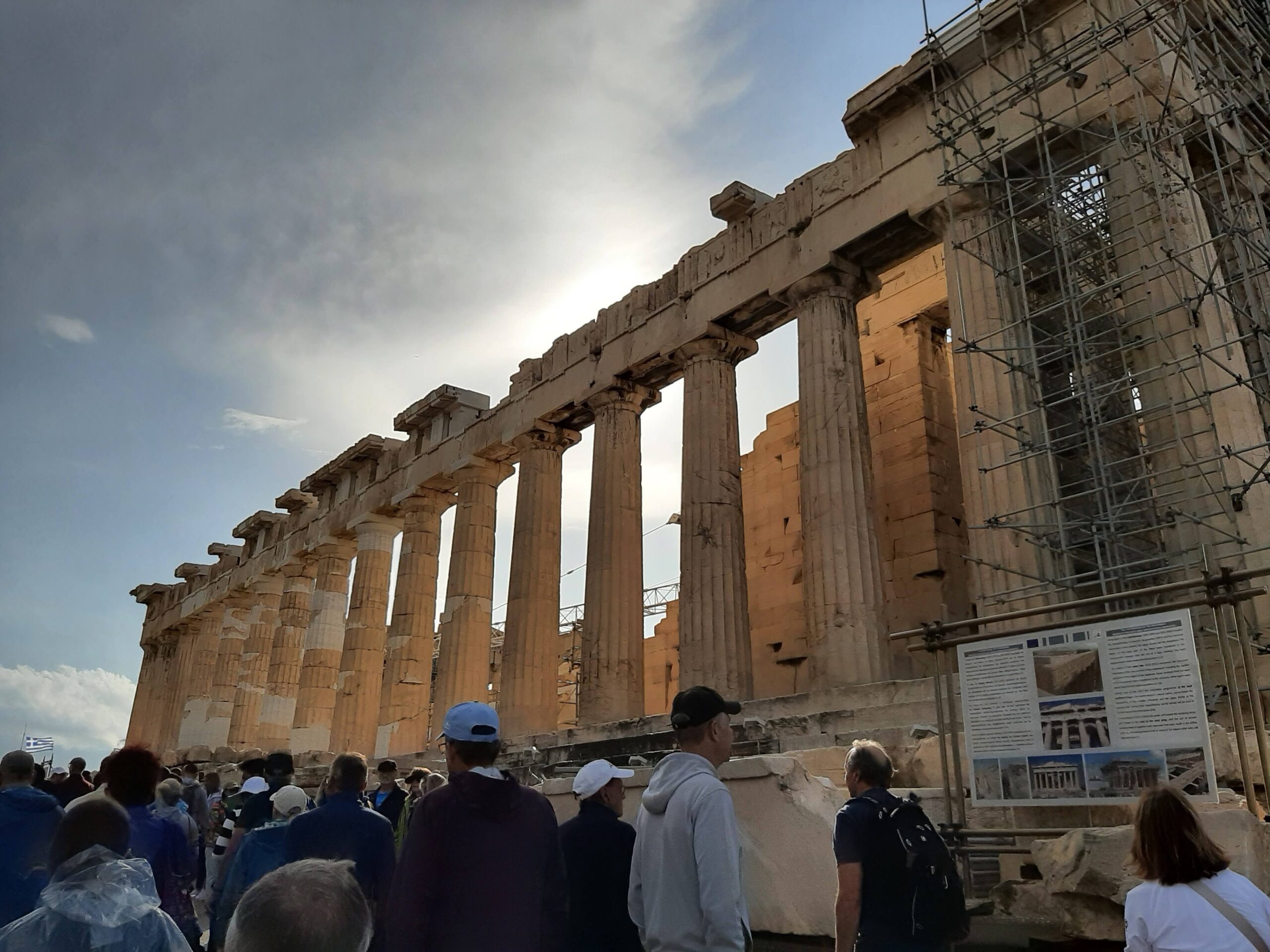 The Acropolis is the hilltop, the Parthenon is the Temple of Athena which still sits atop the Acropolis, along with other temples, theatres, stoas etc. The view over Athens is amazing ! As we made our way up the hill, the weather cleared and blue skies appeared - the Gods must have known we were visiting ! Earlier crowd numbers were down but soon increased as the weather improved. Artemis was a great guide and we learnt a lot about the history and structures on the Acropolis.