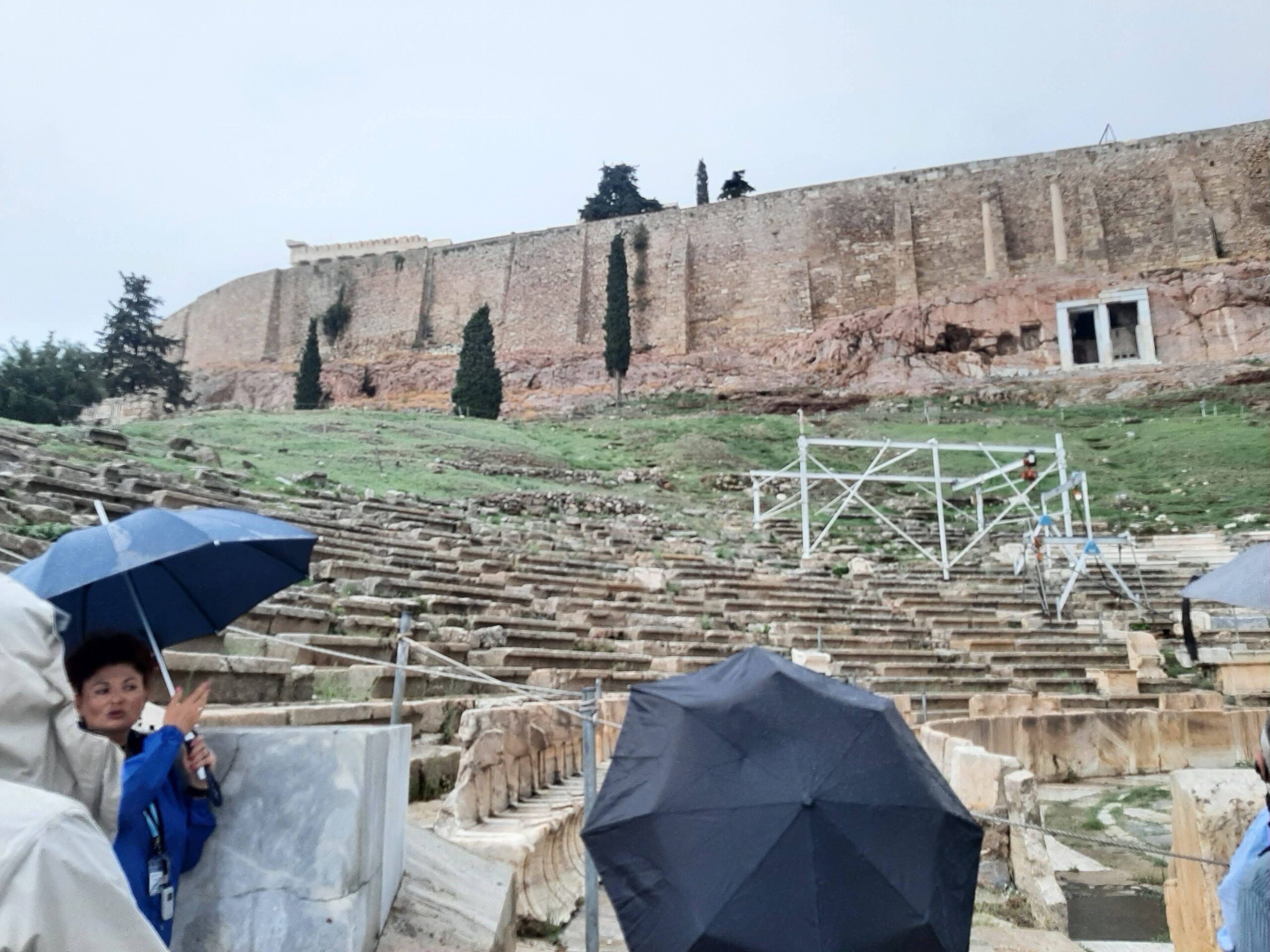 We woke next morning around 5am to thunder, lightning and earlier rain ! Checking messages and our tour hadn't been cancelled yet. So at 7:40 with umbrellas and rain jackets handy, we headed off to the meeting point for our 4 hour tour, about an 8 minute walk away. Halfway there the jacket was on and the umbrella open. We arrived at the office of Athens Walks before the required 8.00am and they were still uncertain if the tour would go ahead or not. Last minute phone calls awaiting advice from the Acropolis as to whether they were going to open or not ! At 8:15 we were ok to go, it was still raining but it was getting lighter. Our group was 16 people and our knowledgeable guide was Artemis (also the name of a virgin Greek goddess).