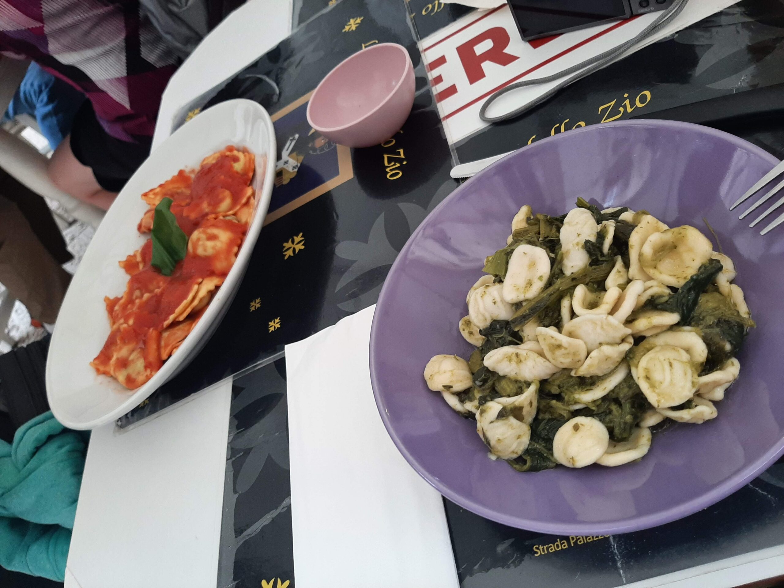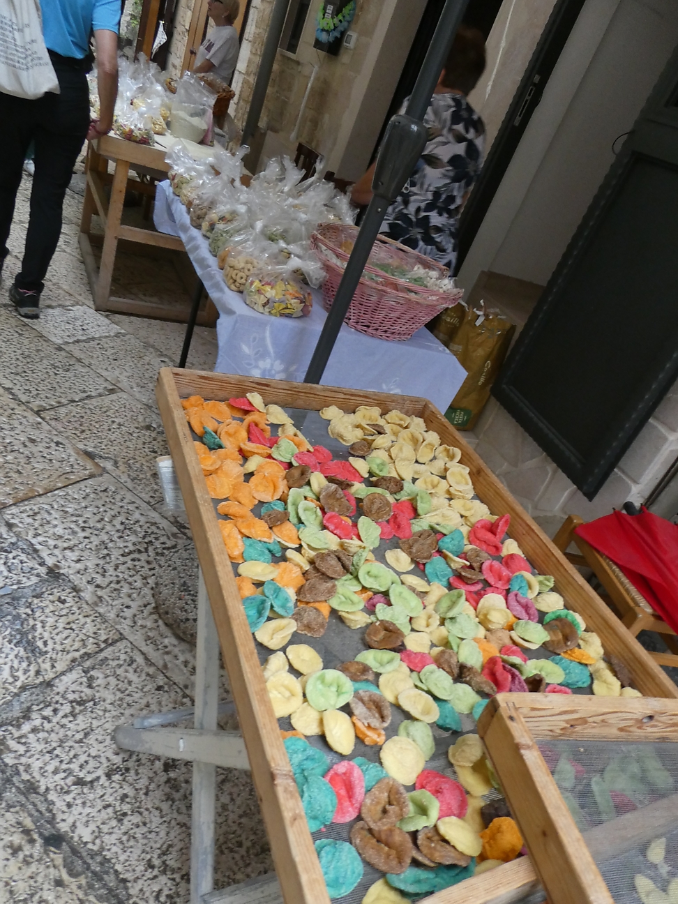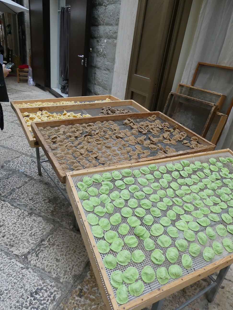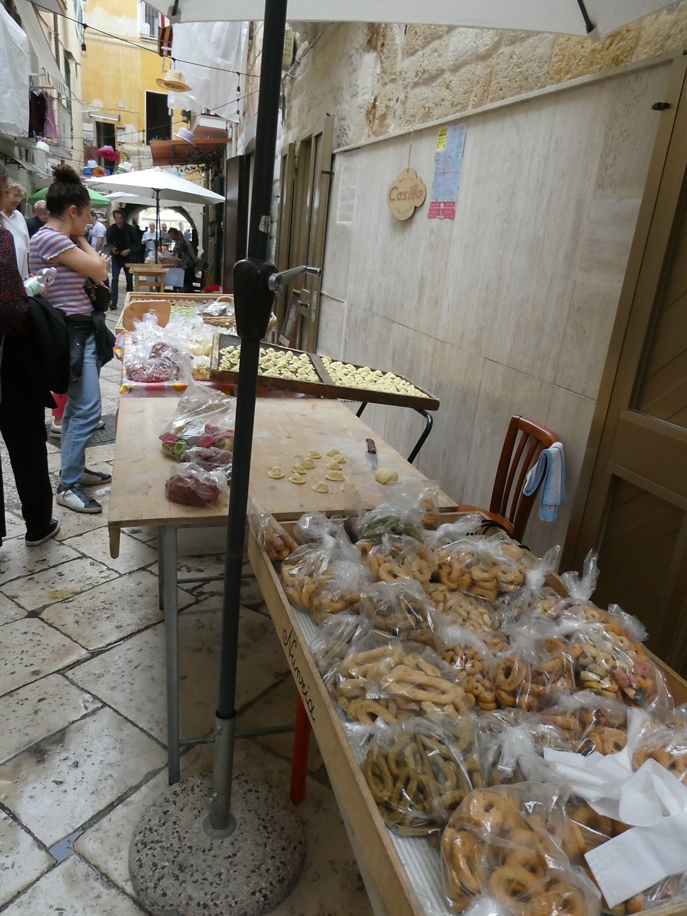 Centro was similar to the others we had been exploring, but one stand out here was being able to watch as women formed up fresh pasta in the laneways as we stood and watched. This encouraged us to have some pasta for lunch, stopped at a restaurant, ordered some orcchiette di rapa (pasta with turnip heads) and some ravioli with tomato sauce. As always we share the dishes, but in this case both were uninspiring and luke warm - very disappointing ! At least Tania's tiramisu was acceptable. It started to rain in Bari but never amounted to much - thunderstorms had been predicted !