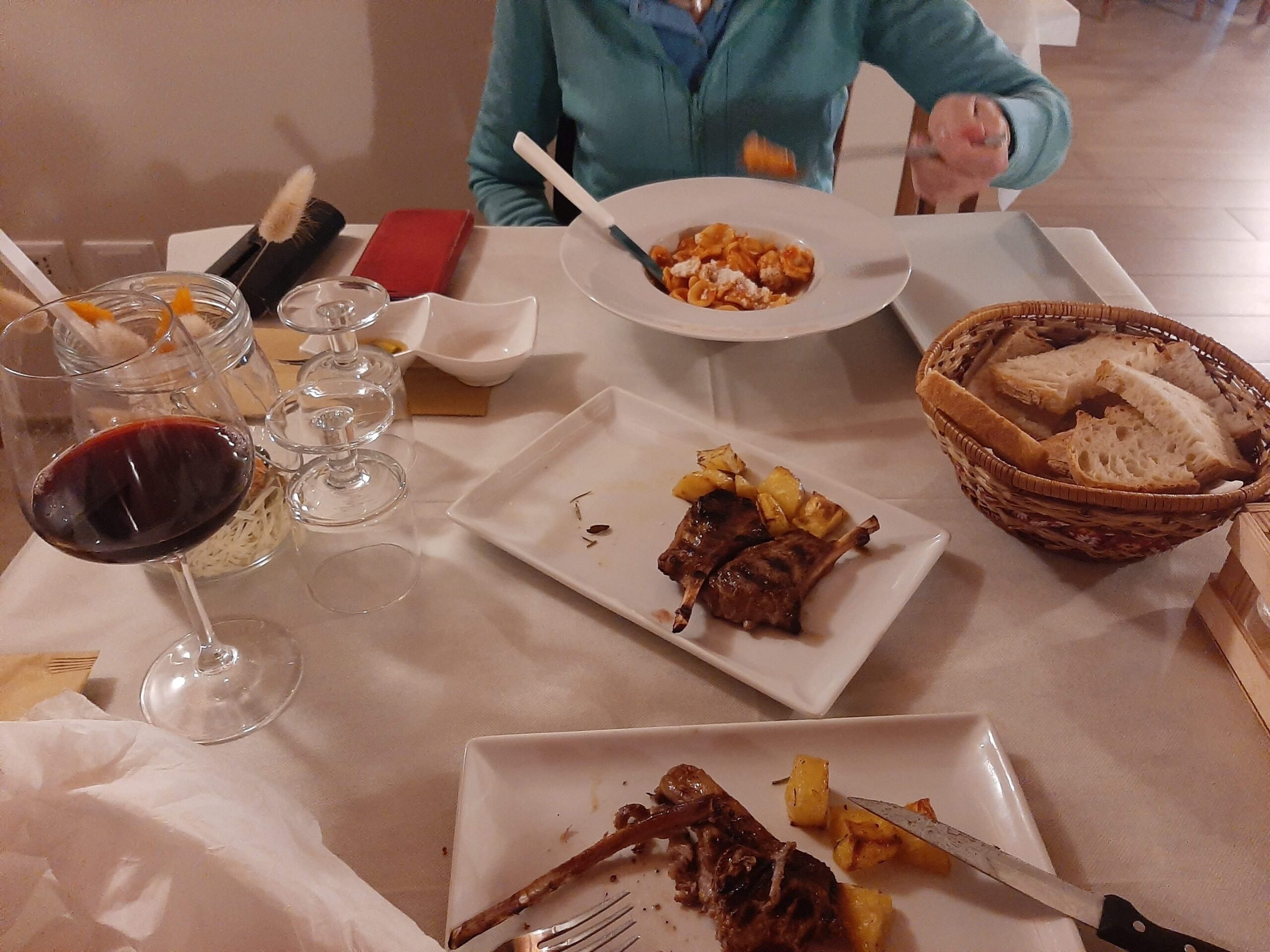 First off, fresh bread with olive oil and dried tomatoes, the olive oil is so nice and a product of the farm. The bread didn't last long before we asked for more. Main course we shared a orecchiette pomodoro, and grilled lamb chops and baked potatoes - Yum Yum. Sweets - tiramisu and molten chocolate cake and icecream. It is up there as one of the best meals we have had this trip ! Graeme had some Montepulciano, a red wine made onsite as well which was very delicious - and all reasonable priced.