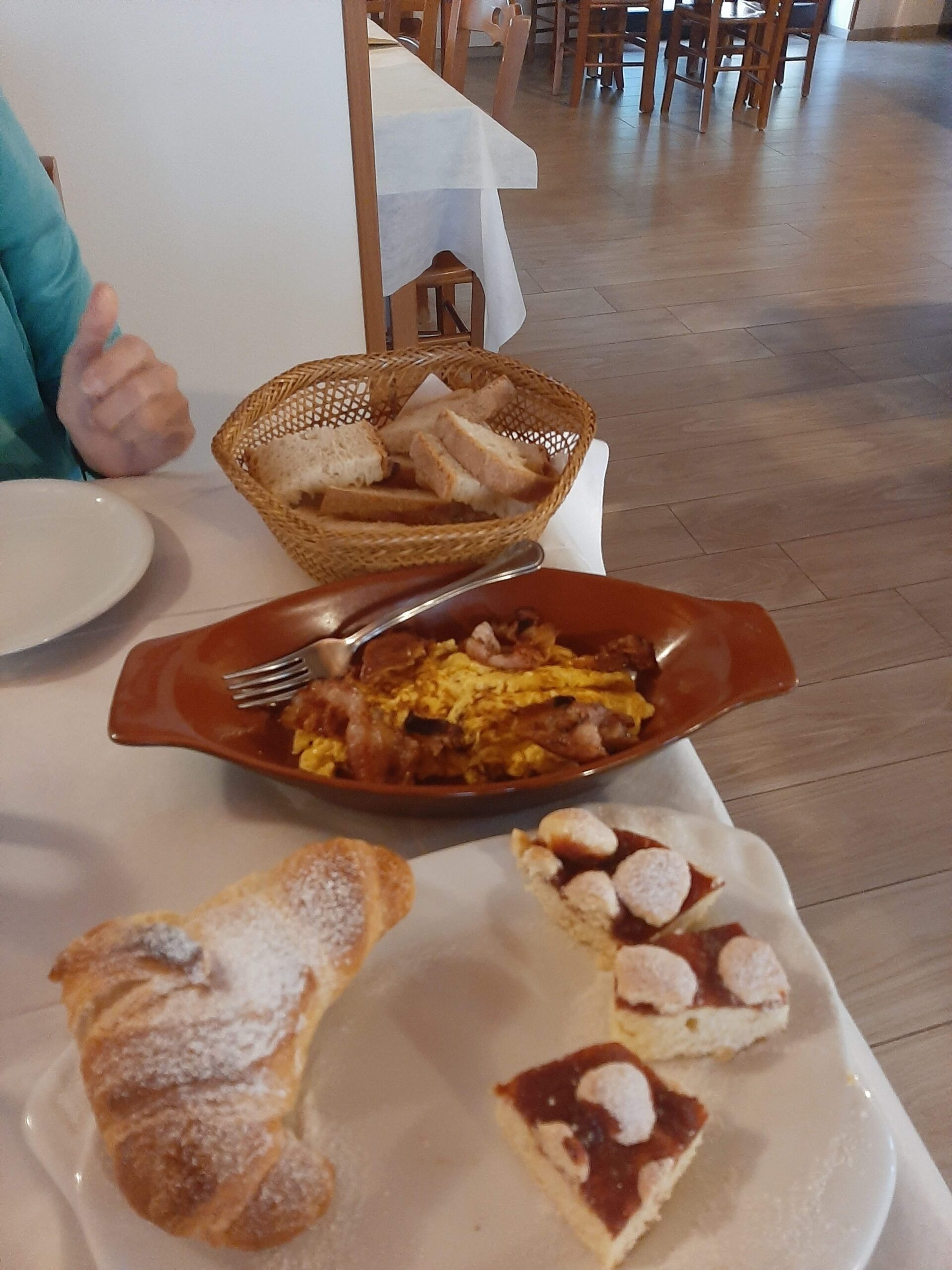 Next morning (Friday) we arrived back at the restaurant for our 8euro breakfast. Home made cakes, croissants with jam, eggs and crispy prosciutto, coffees, fresh fruit, juice and more bread ! Wow - didn't need lunch!