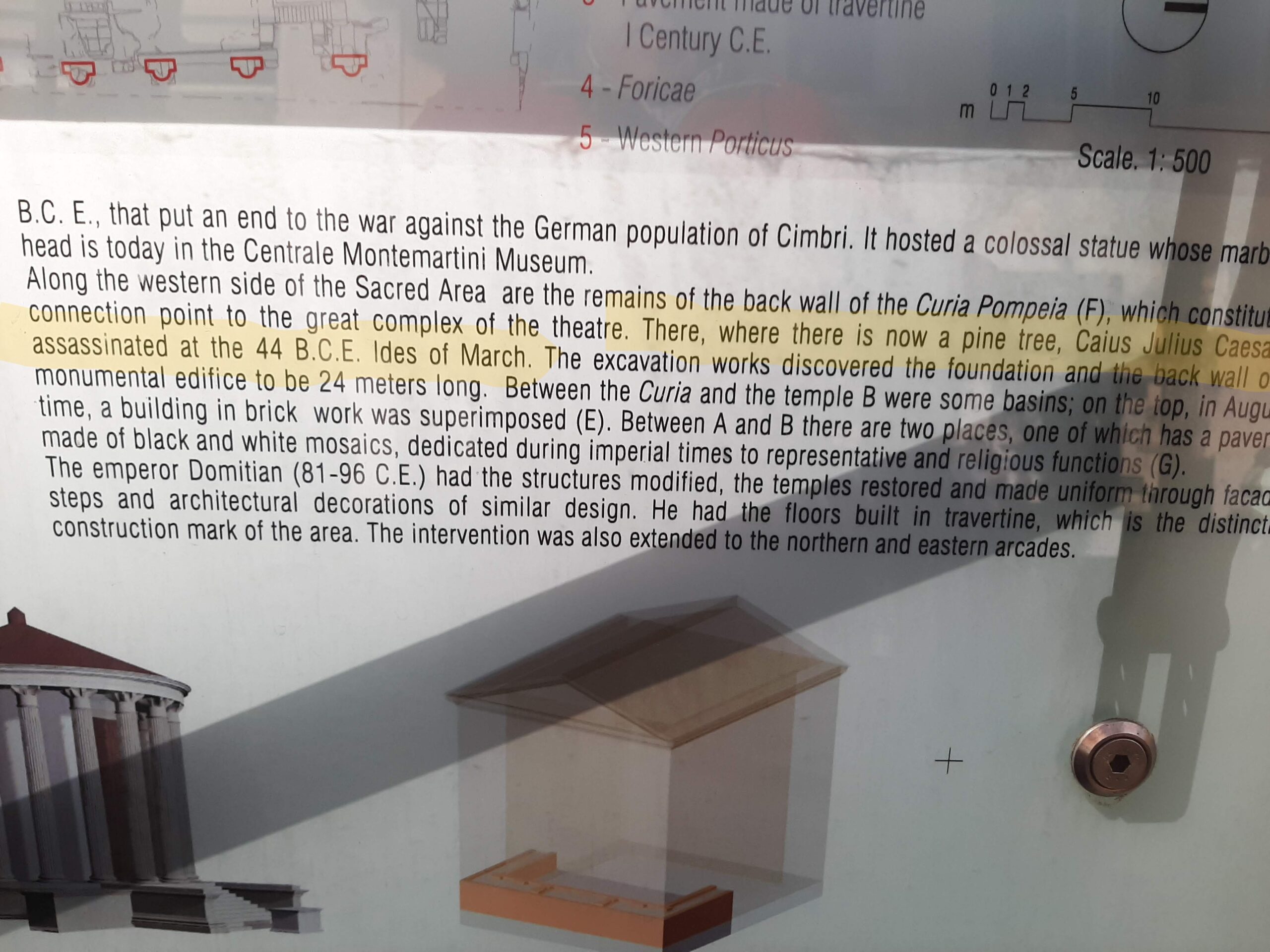Part of the Tania tour took us past the Curia de Pompey where Julius Caesar was assassinated on the Ides of March - see more info 44bc. https://arstechnica.com/science/2022/02/confirmed-curia-of-pompey-where-julius-caesar-was-killed-was-built-in-three-phases/
