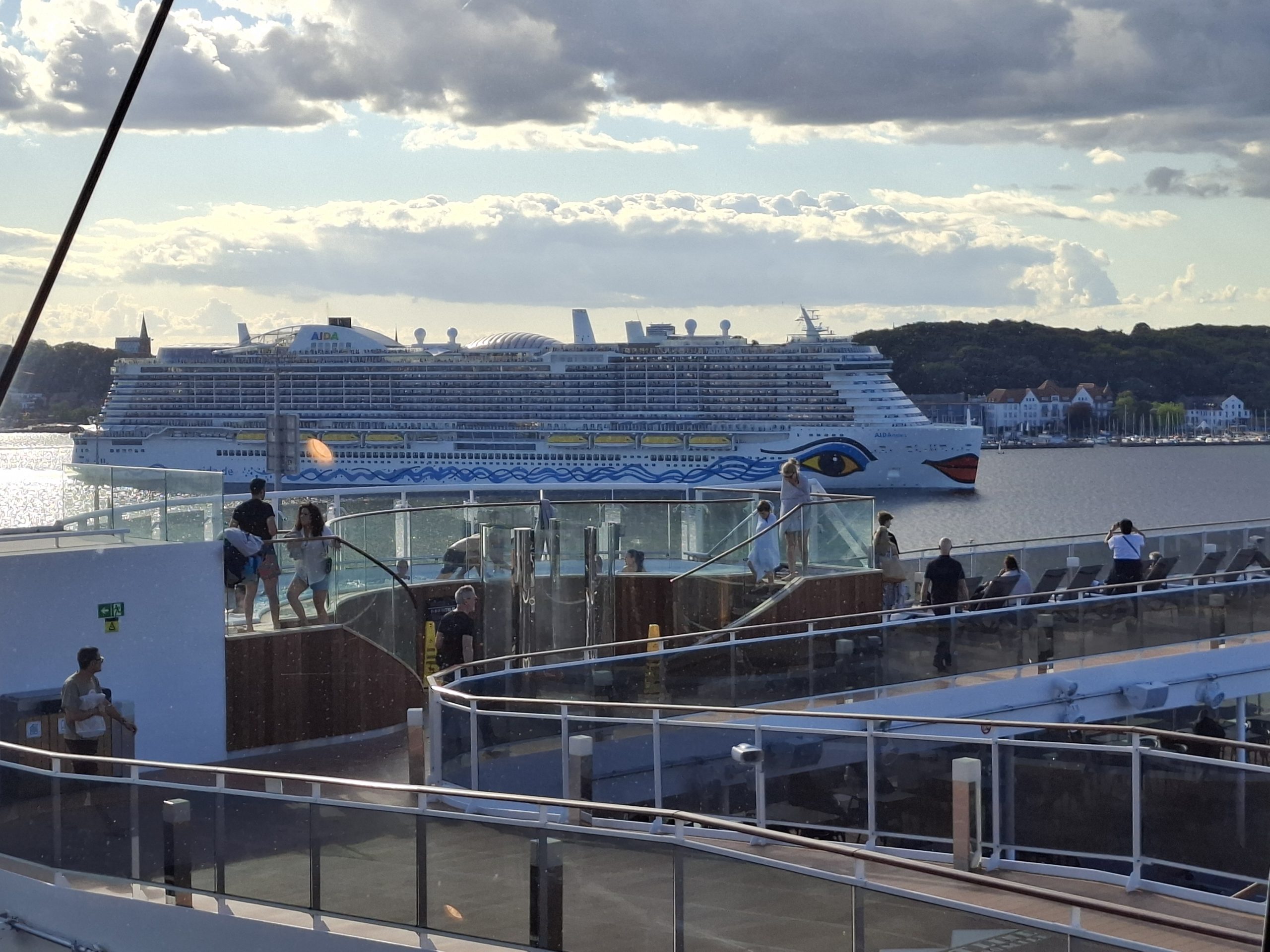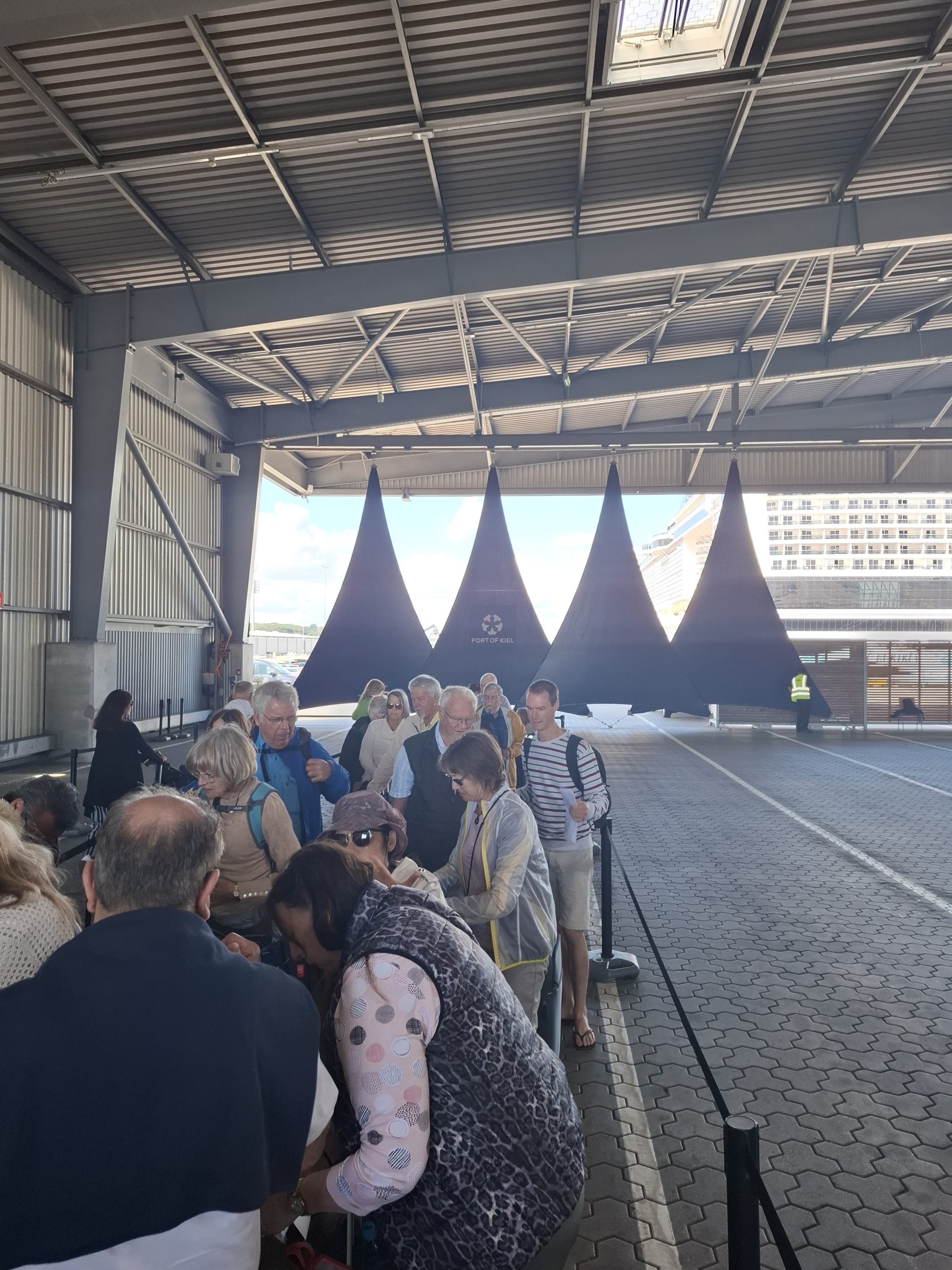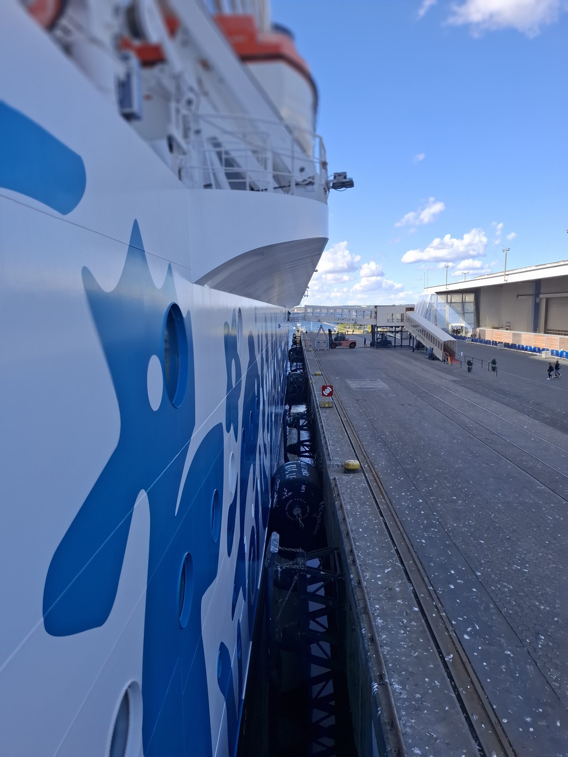 Today Henriette is looking after us, and she gave us lots of good information on Denmark. The drive took almost 5 hours and we got to the ship terminal in Kiel around 14:00. We had to check in our bags and go through security. The process took us a while and there were lots of passengers embarking, and as we found out, lots were already on the ship. The ship is huge, with over 6000 passengers and 1400 crew onboard. It is also very glitzy, with lots of shops, bars, theatres, lounge rooms, pools etc etc.