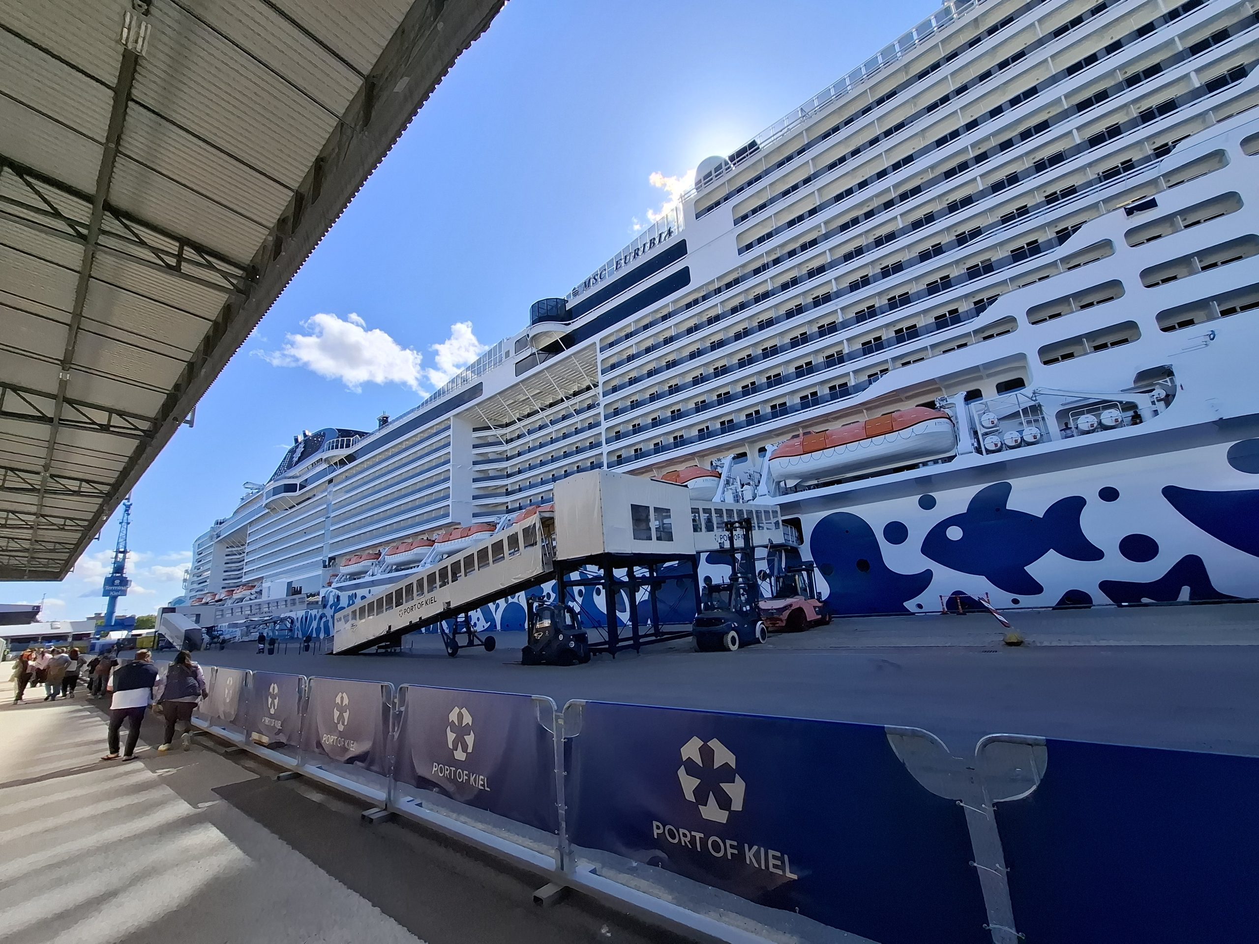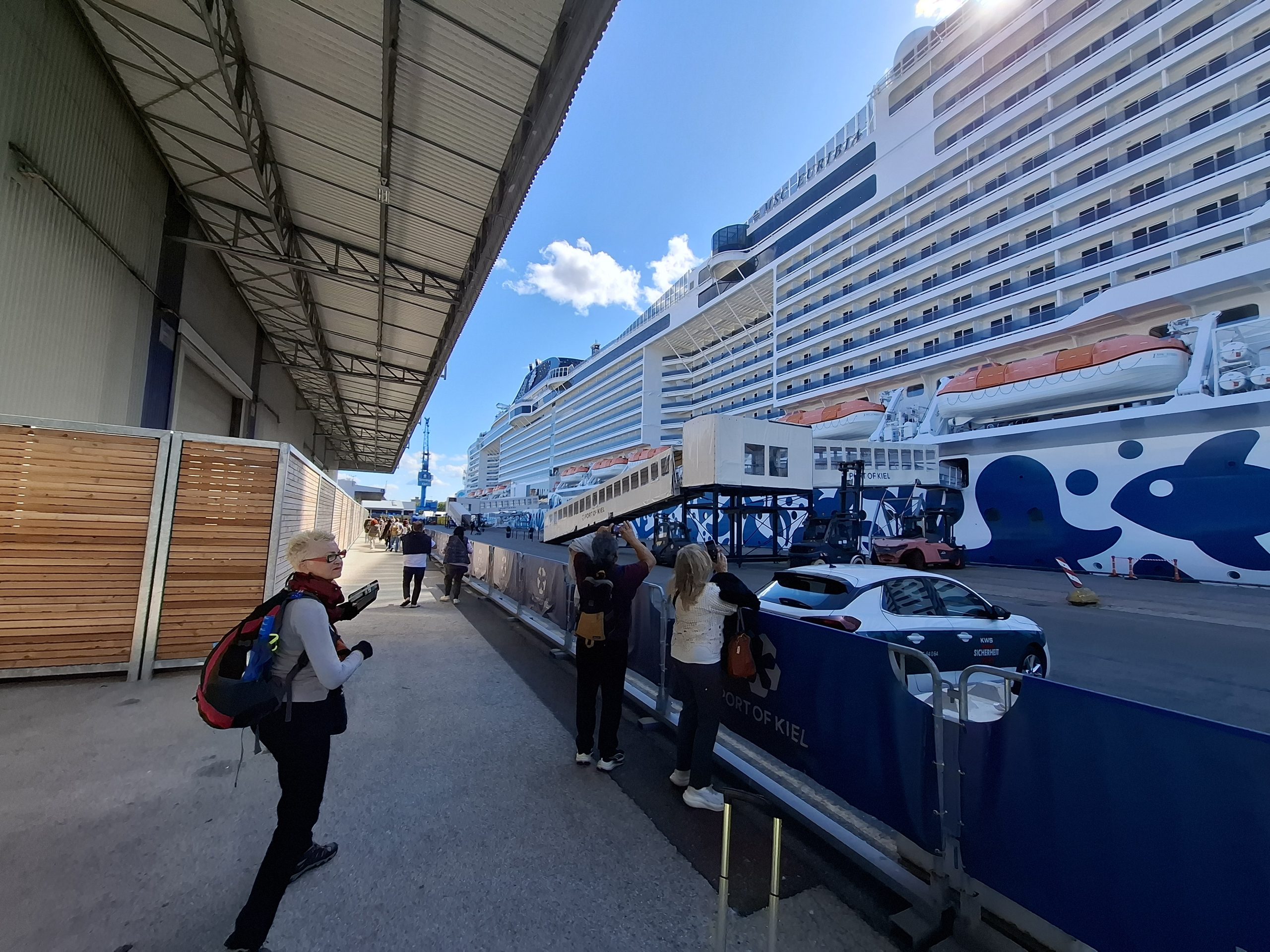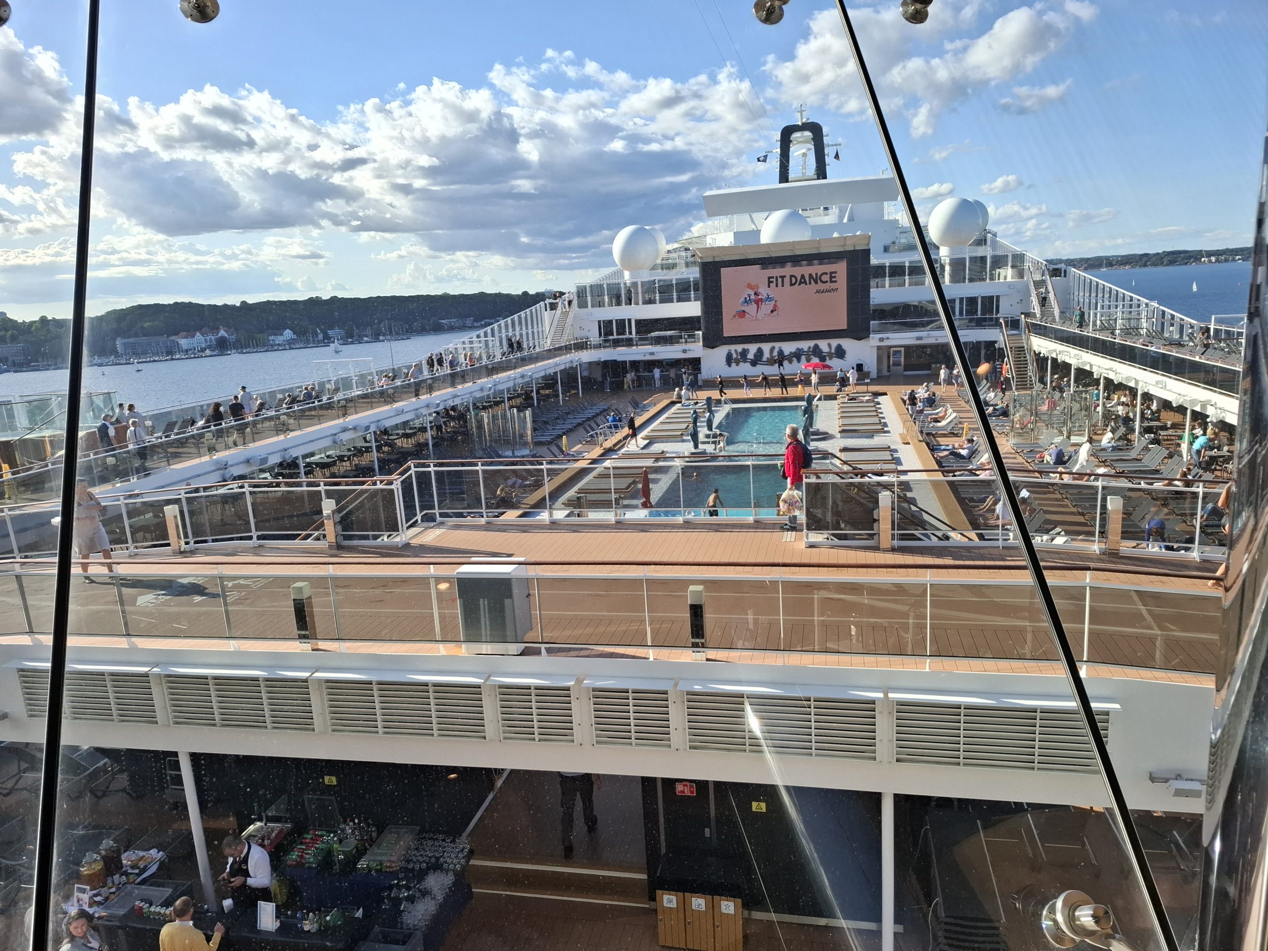 Today Henriette is looking after us, and she gave us lots of good information on Denmark. The drive took almost 5 hours and we got to the ship terminal in Kiel around 14:00. We had to check in our bags and go through security. The process took us a while and there were lots of passengers embarking, and as we found out, lots were already on the ship. The ship is huge, with over 6000 passengers and 1400 crew onboard. It is also very glitzy, with lots of shops, bars, theatres, lounge rooms, pools etc etc.