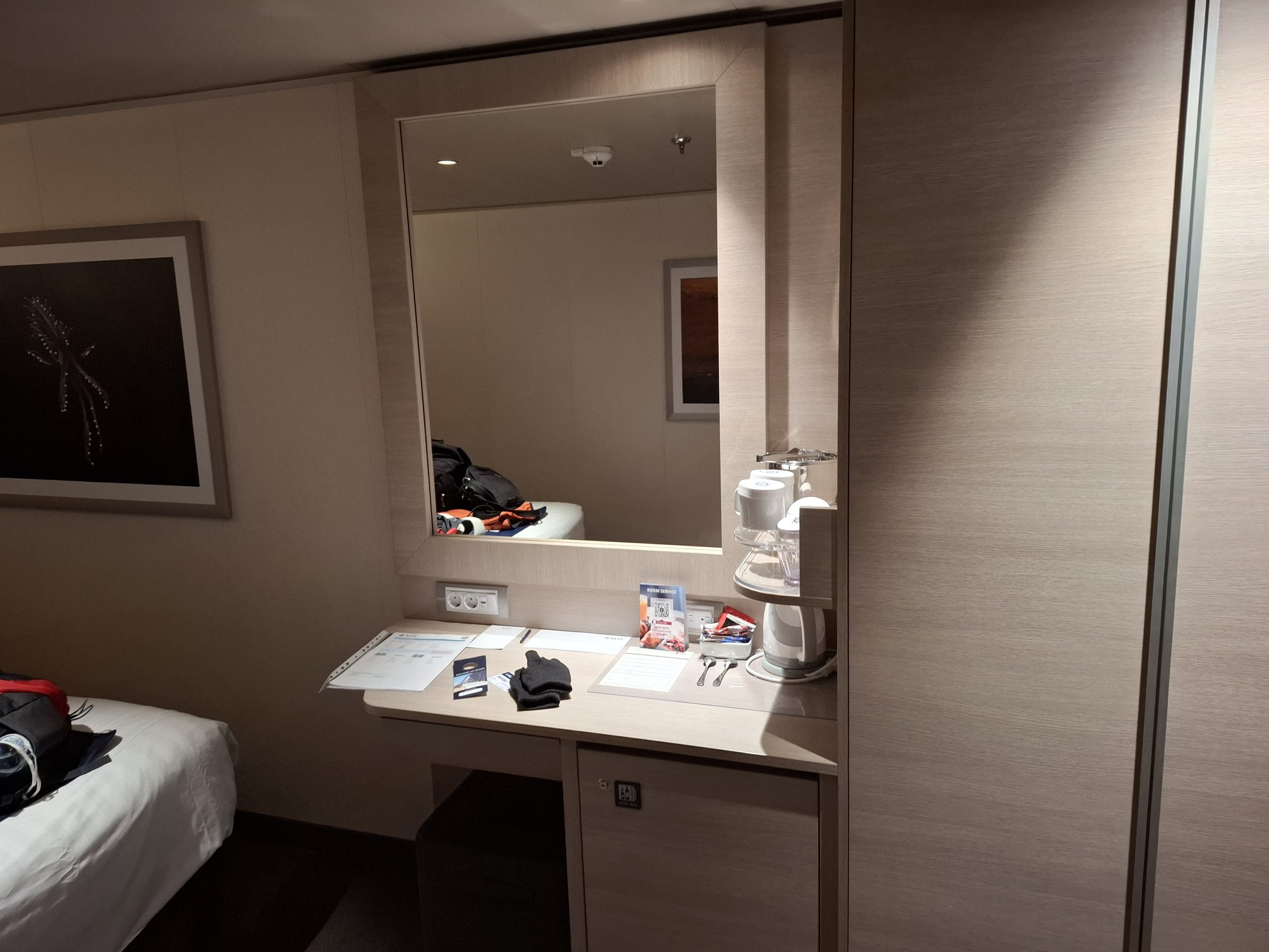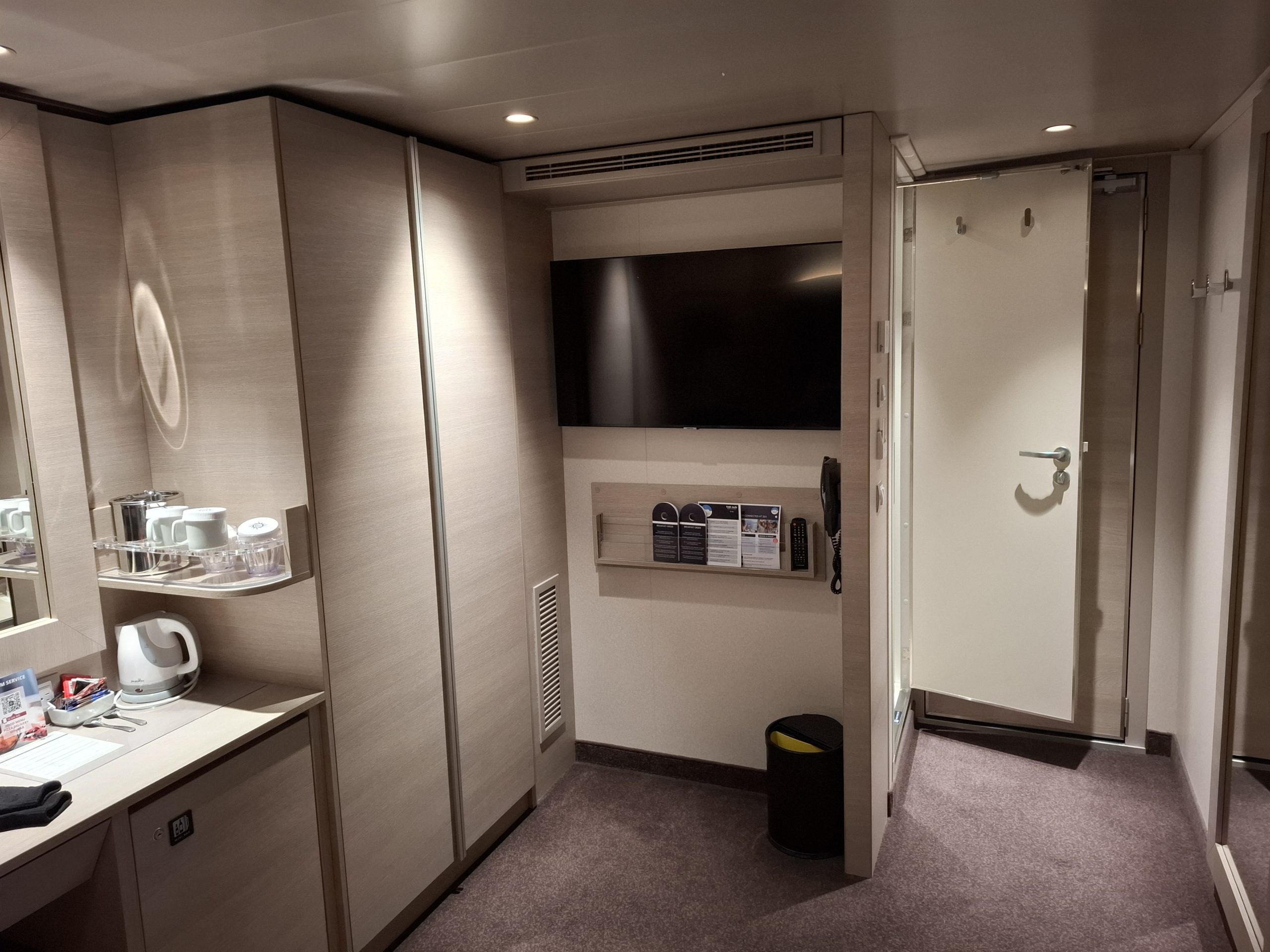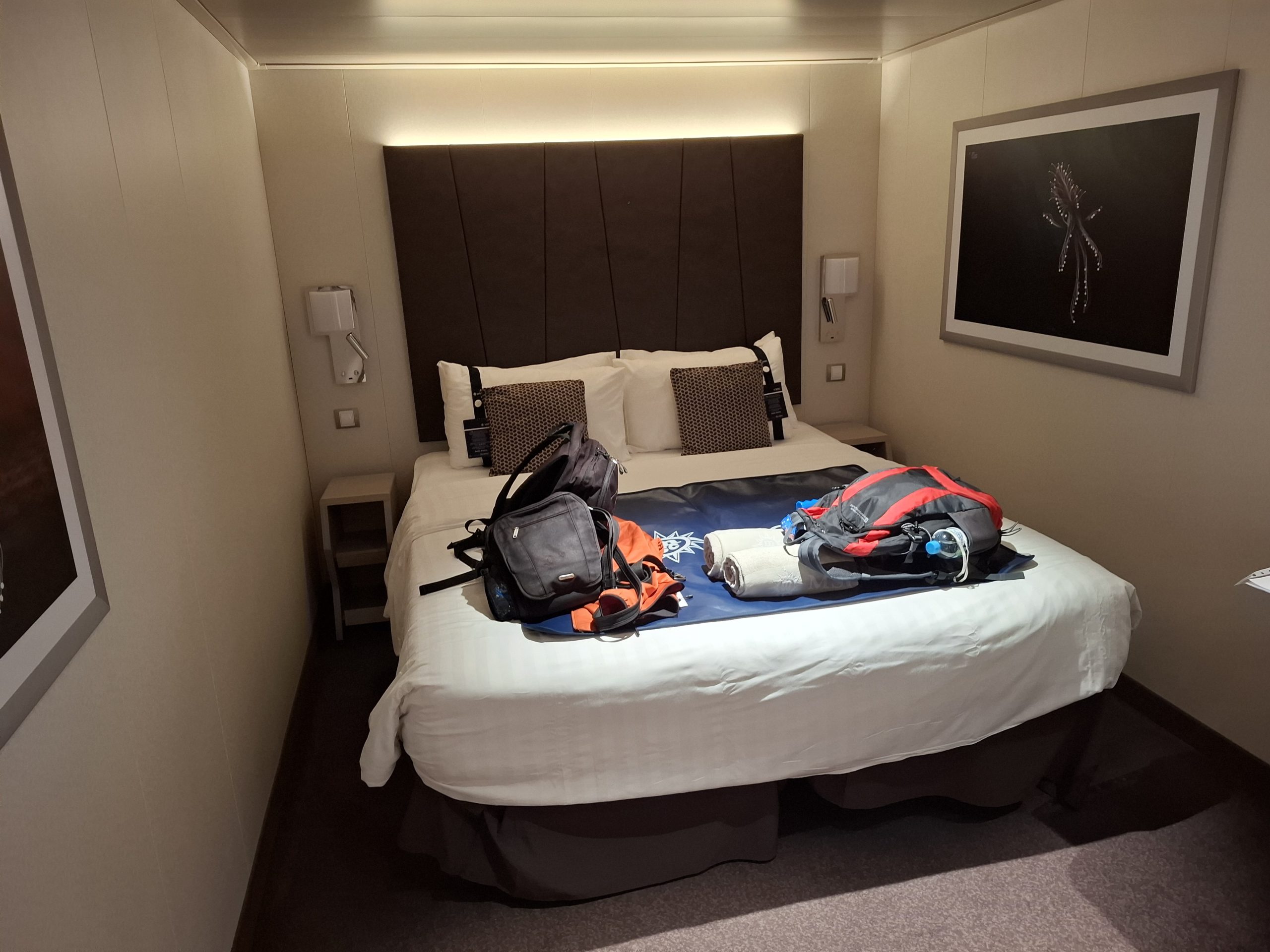 Being cruise ship virgins, it was a bit overwhelming. Also being newbies, it took a while for us to locate our cabin, but eventually found it. It was a pleasant surprise, after the small cabins on the ferries, our basic inside cabin was surprisingly large, with a comfortable double bed and still room on the floor for suitcases and still room for us to do back exercises if necessary.