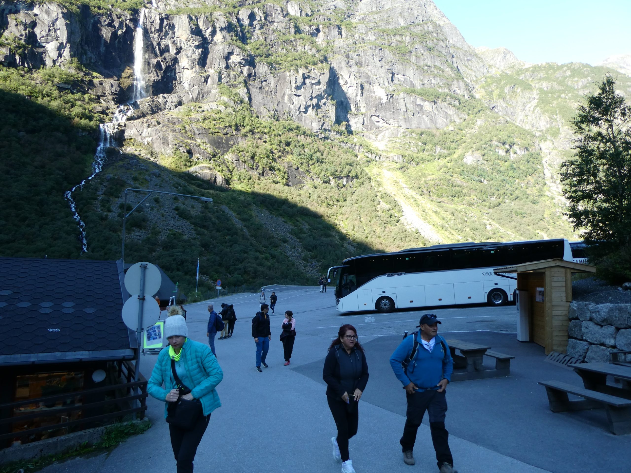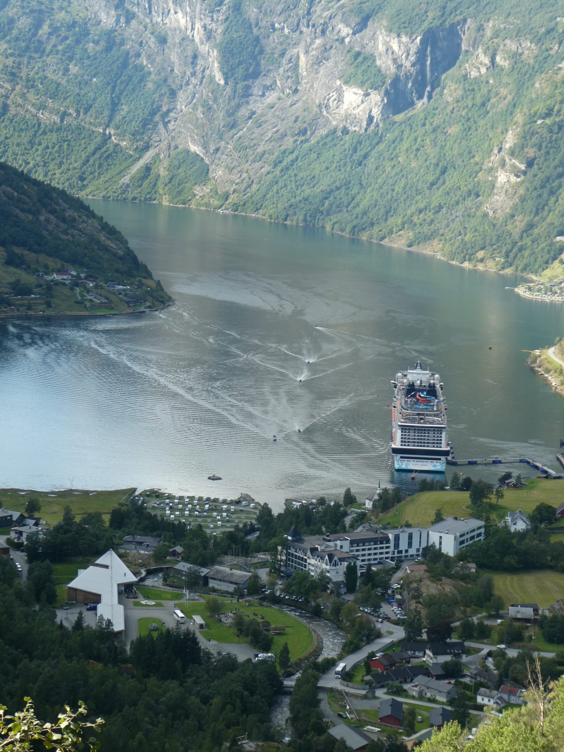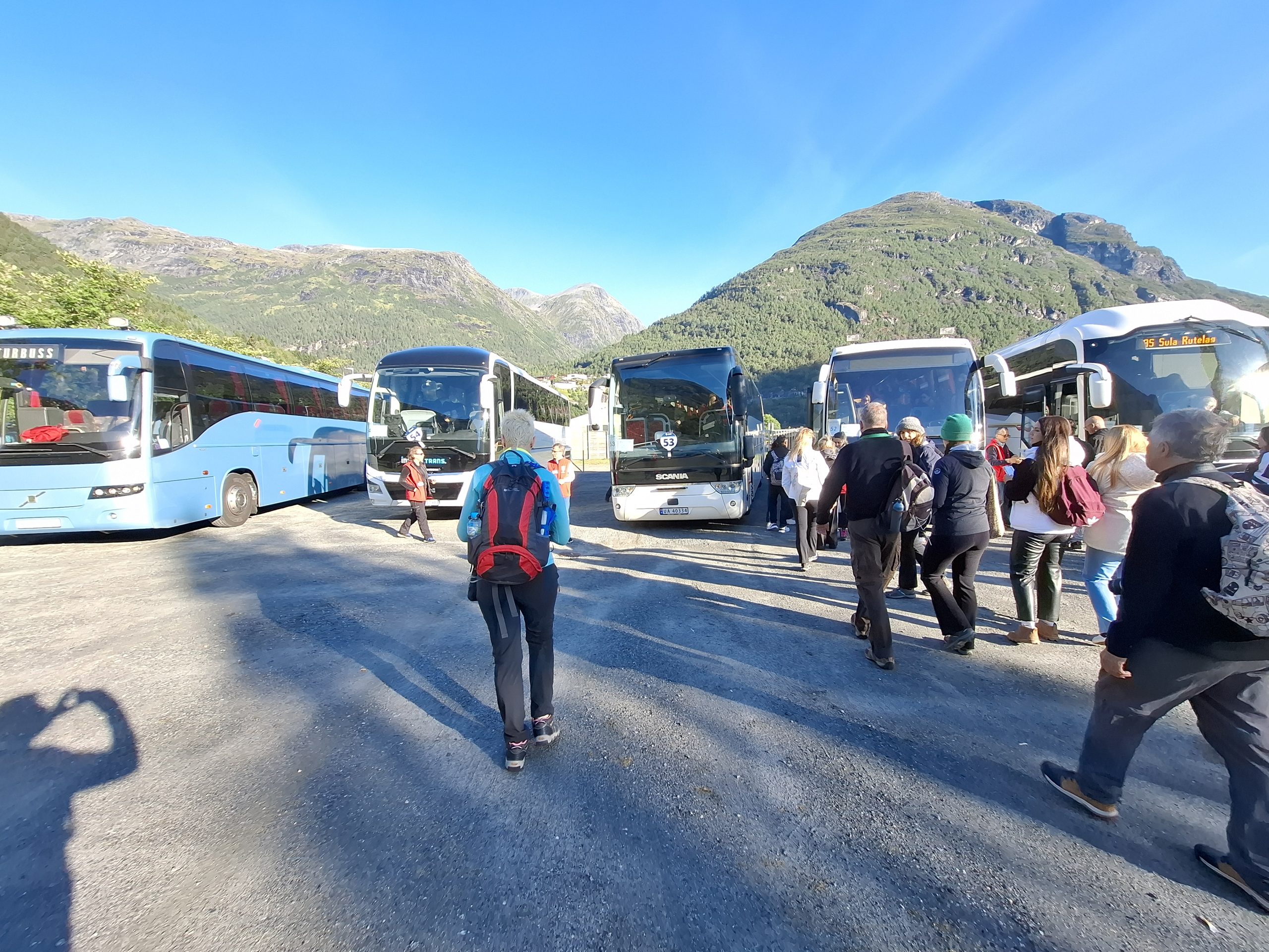 The ship docked in Hellesylt and is only allowing passengers who have excursions booked to depart, it will then continue onto to Geiranger while the excursion participants will meet the ship there. It was a bit like herding cats with hundreds meeting, getting ready for their excursion number to be called and following the guide with the paddle of your excursion number off the ship and onto the waiting bus. We were excursion #53 and although we were amongst the first to leave the lounge for that excursion, by the time we got to our bus it was already half full .. and we are fast walkers. Obviously cruise hardened excursion goers who knew how the system worked were already there !