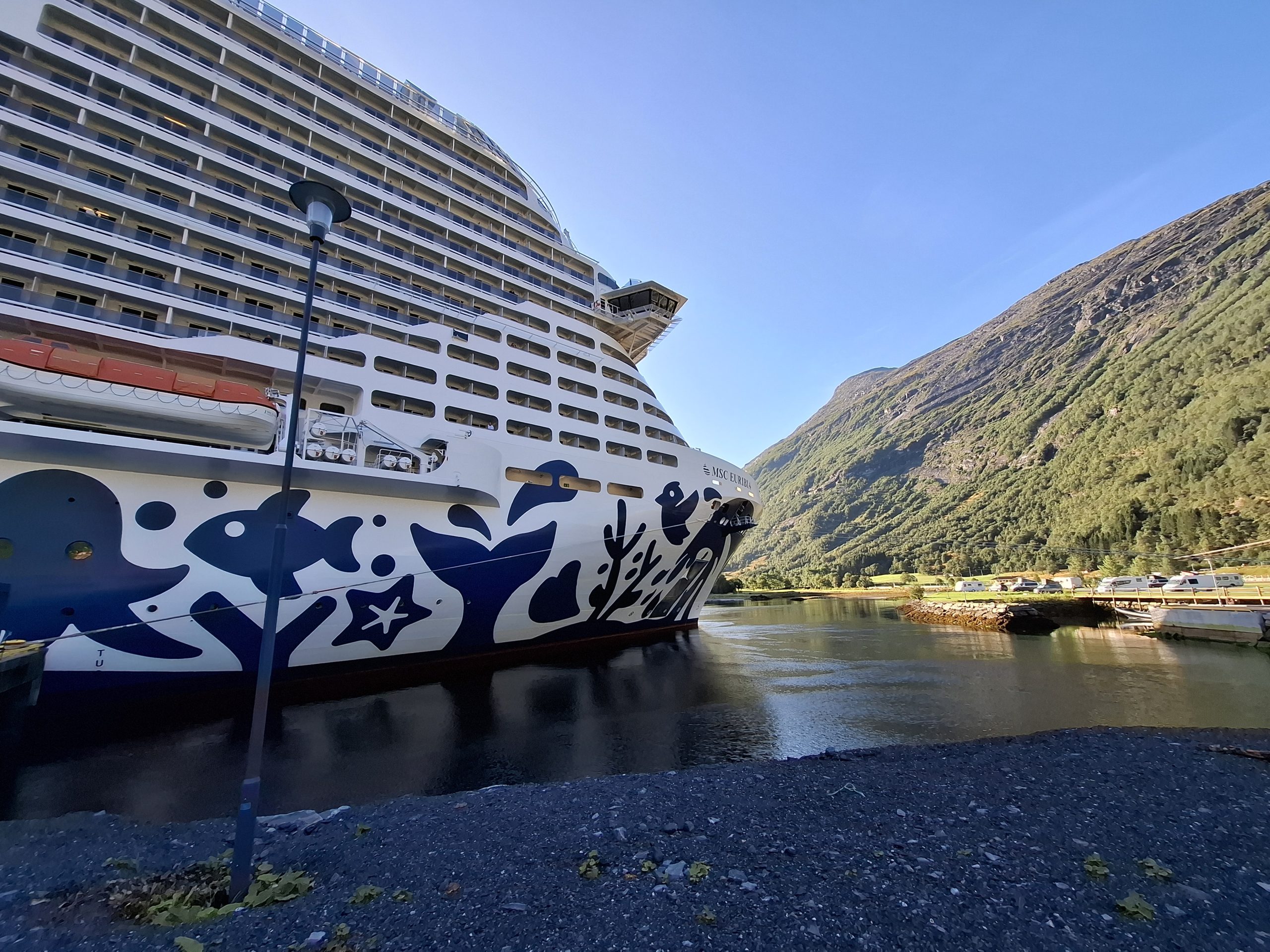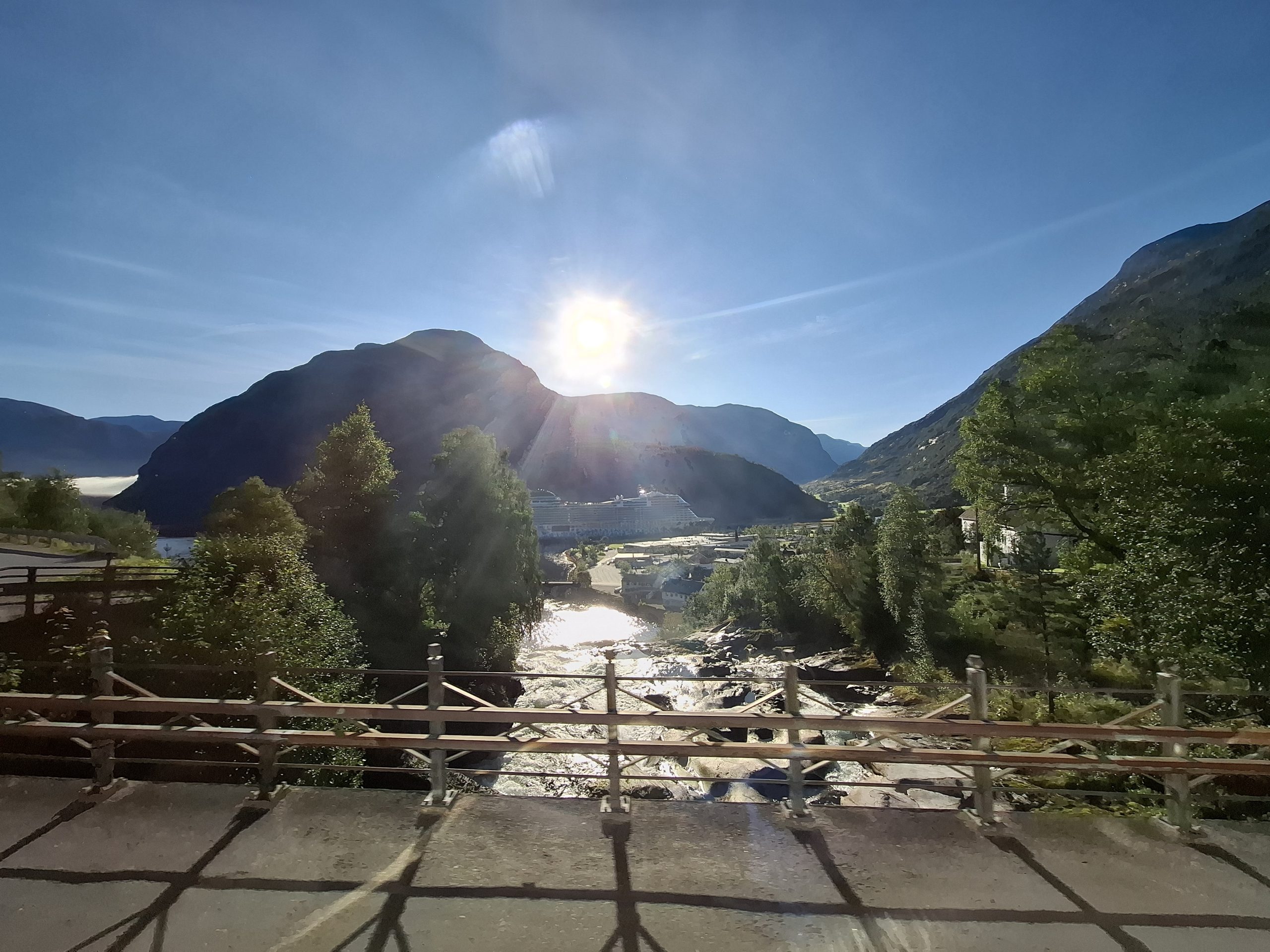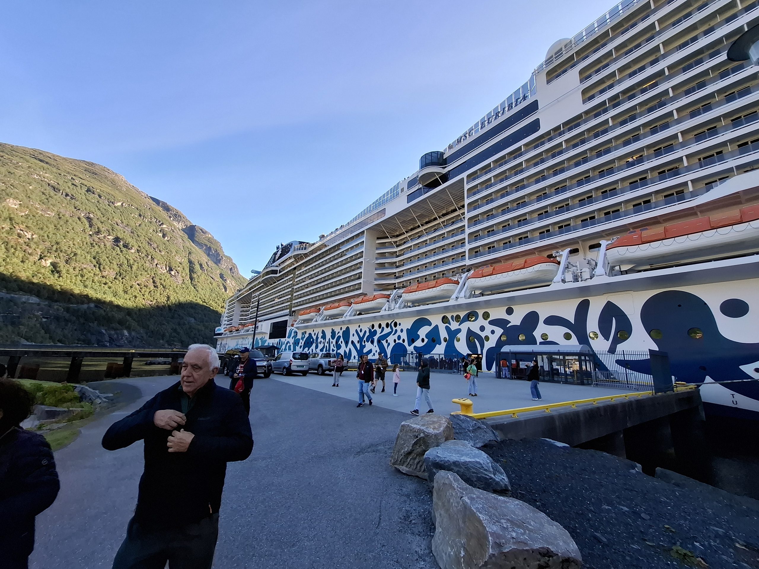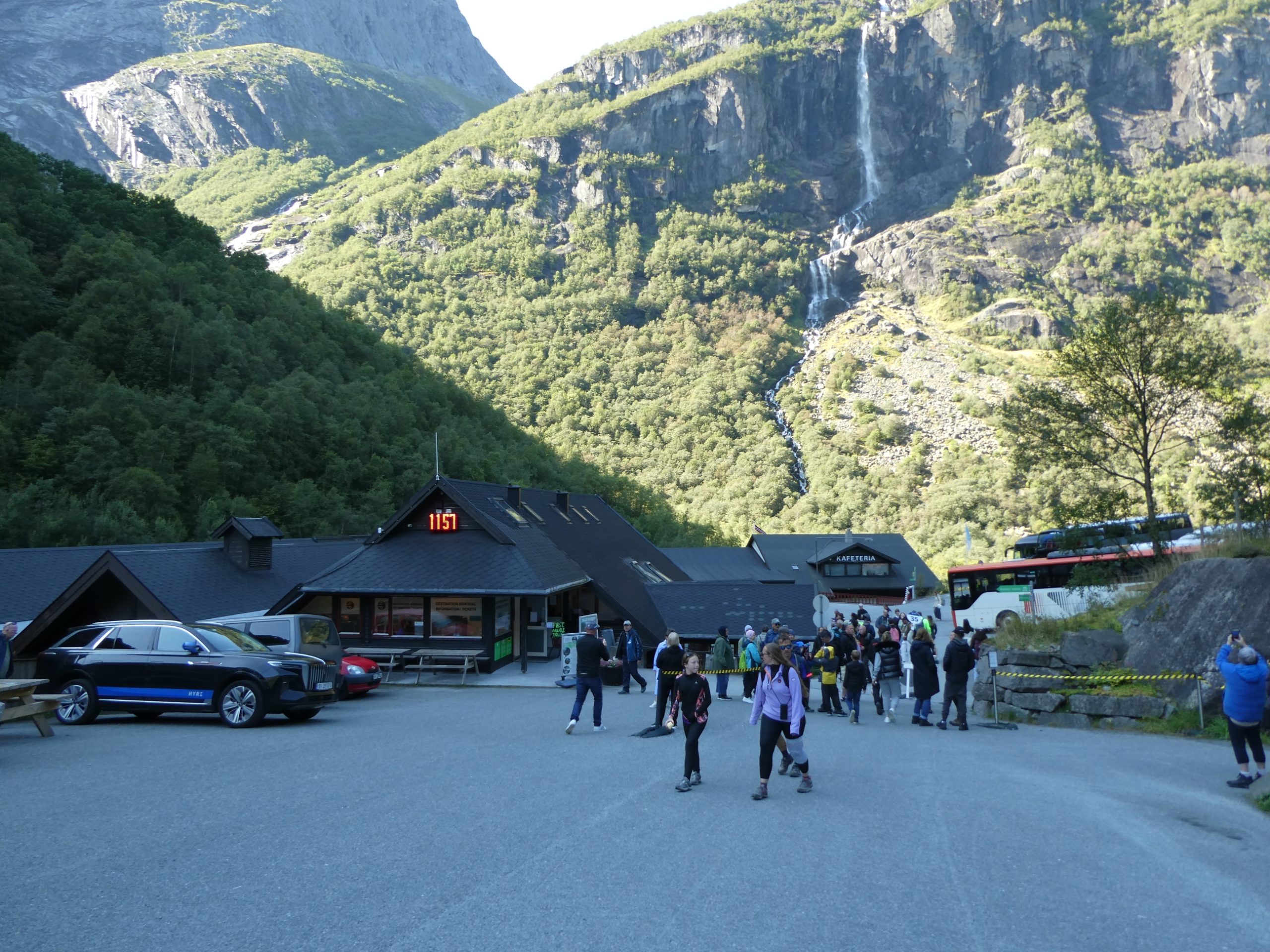 The ship docked in Hellesylt and is only allowing passengers who have excursions booked to depart, it will then continue onto to Geiranger while the excursion participants will meet the ship there. It was a bit like herding cats with hundreds meeting, getting ready for their excursion number to be called and following the guide with the paddle of your excursion number off the ship and onto the waiting bus. We were excursion #53 and although we were amongst the first to leave the lounge for that excursion, by the time we got to our bus it was already half full .. and we are fast walkers. Obviously cruise hardened excursion goers who knew how the system worked were already there !