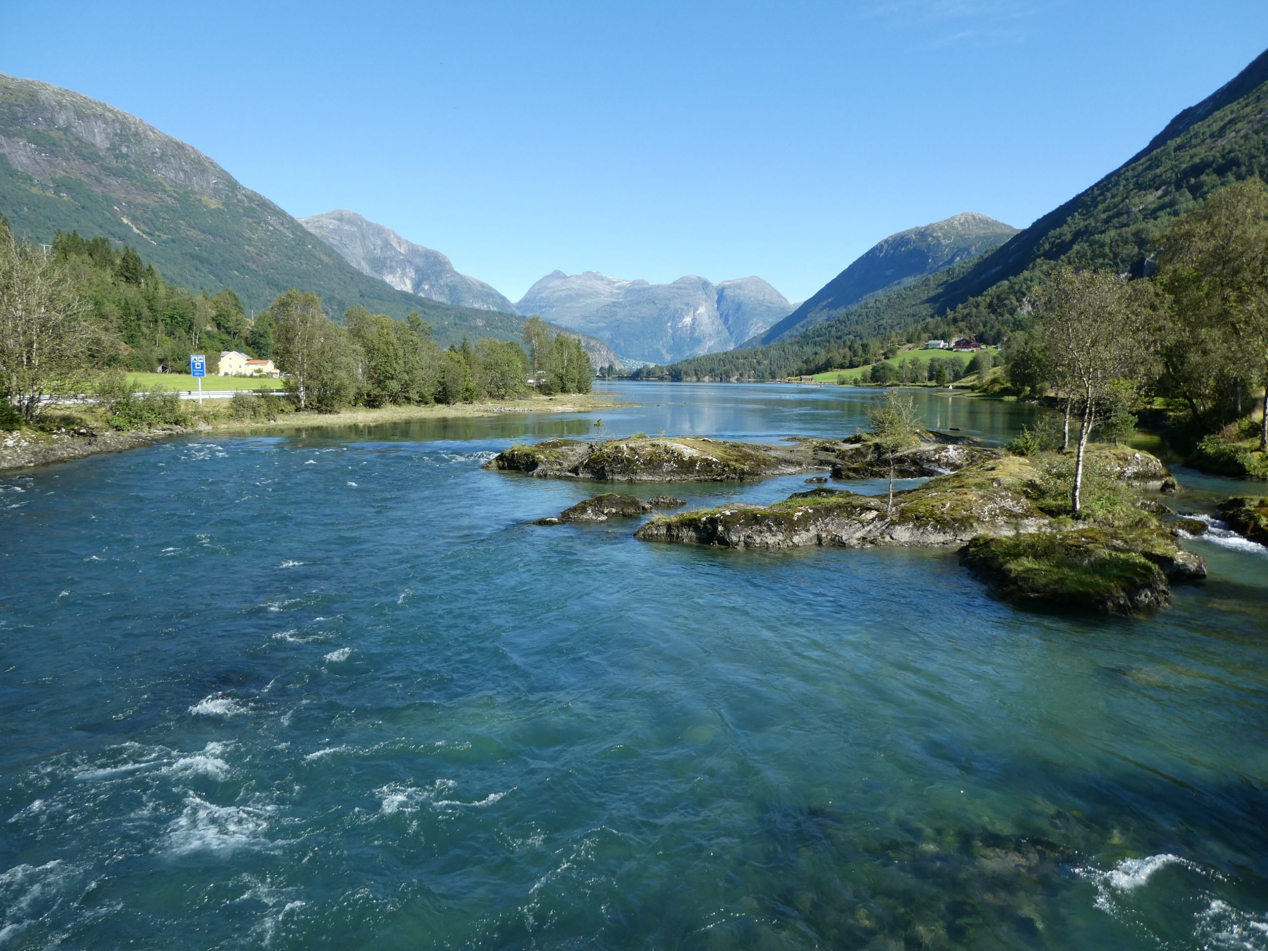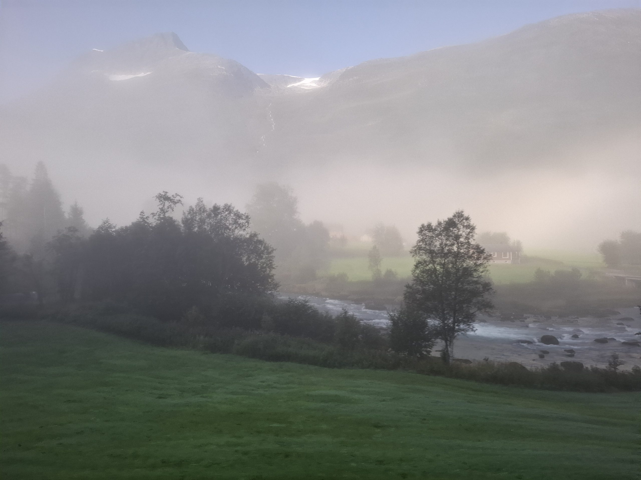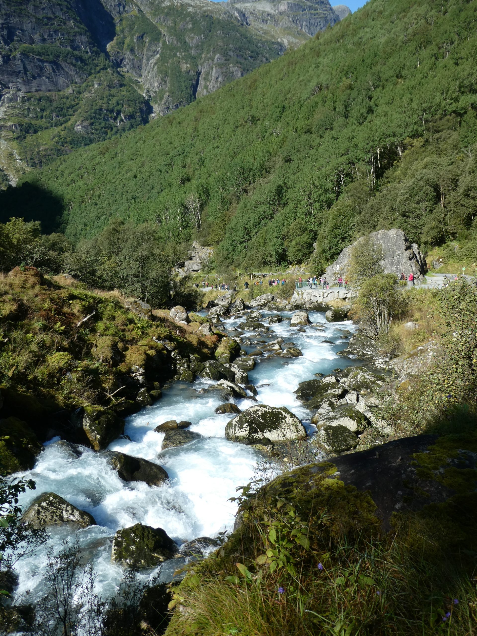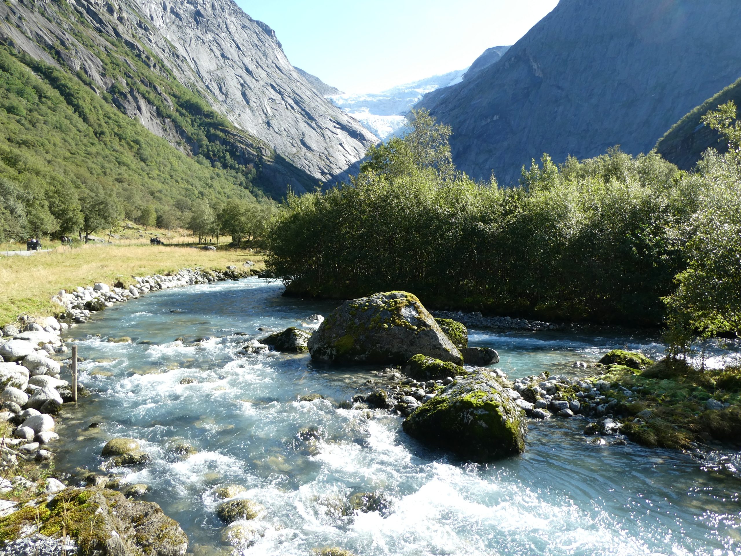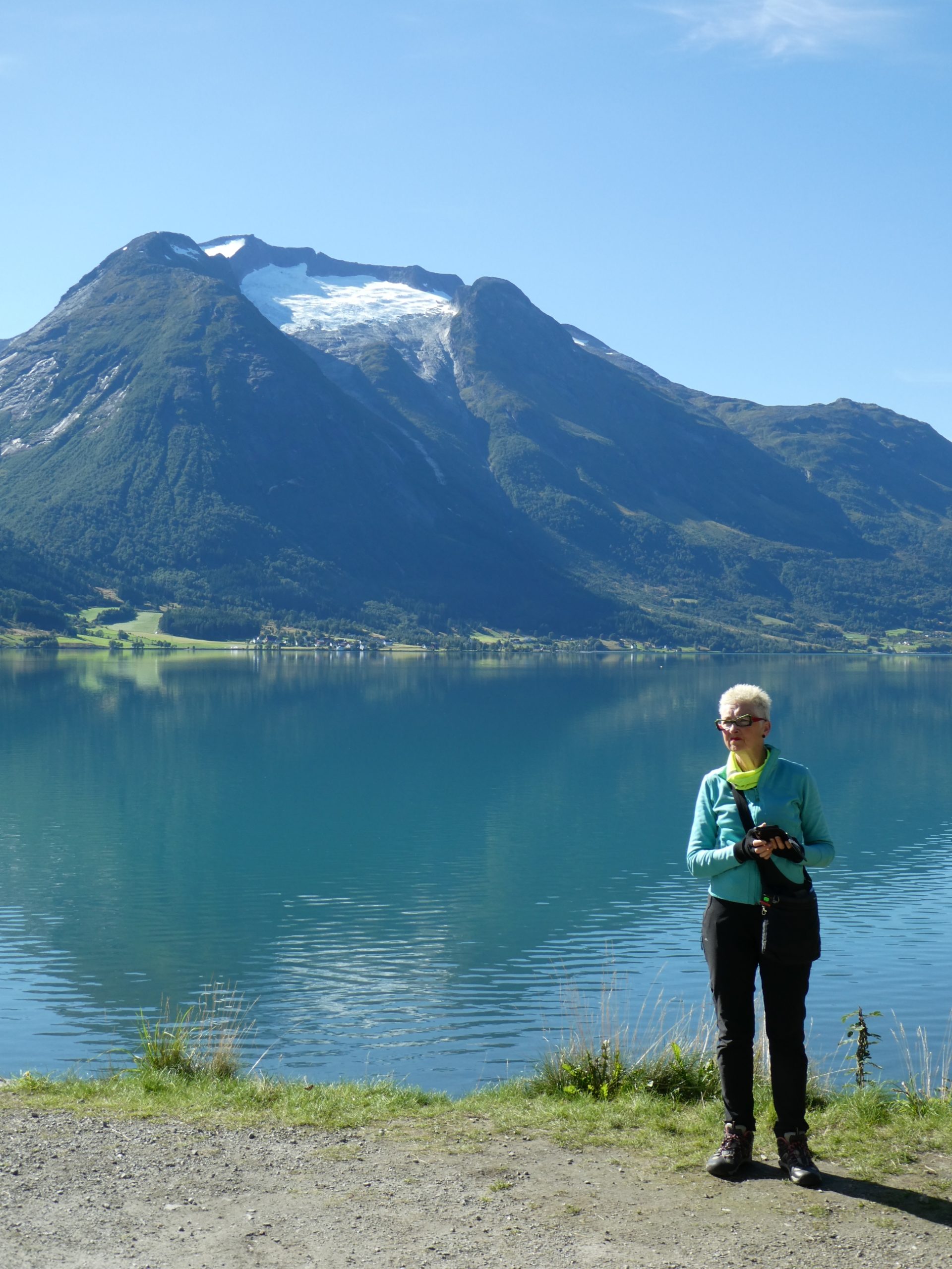 It was a very pleasant drive through the Norwegian countryside through quaint villages and rural farm holdings, as well as river, waterfall and mountain scenery. Early morning there was low cloud hanging over the fiord and visibility was limited for a while but we were told today the weather was going to be great. It did clear up later in the morning and was clear by the time we arrived at Briksdal. There were glaciers on the plateaus and forests as well along the way.