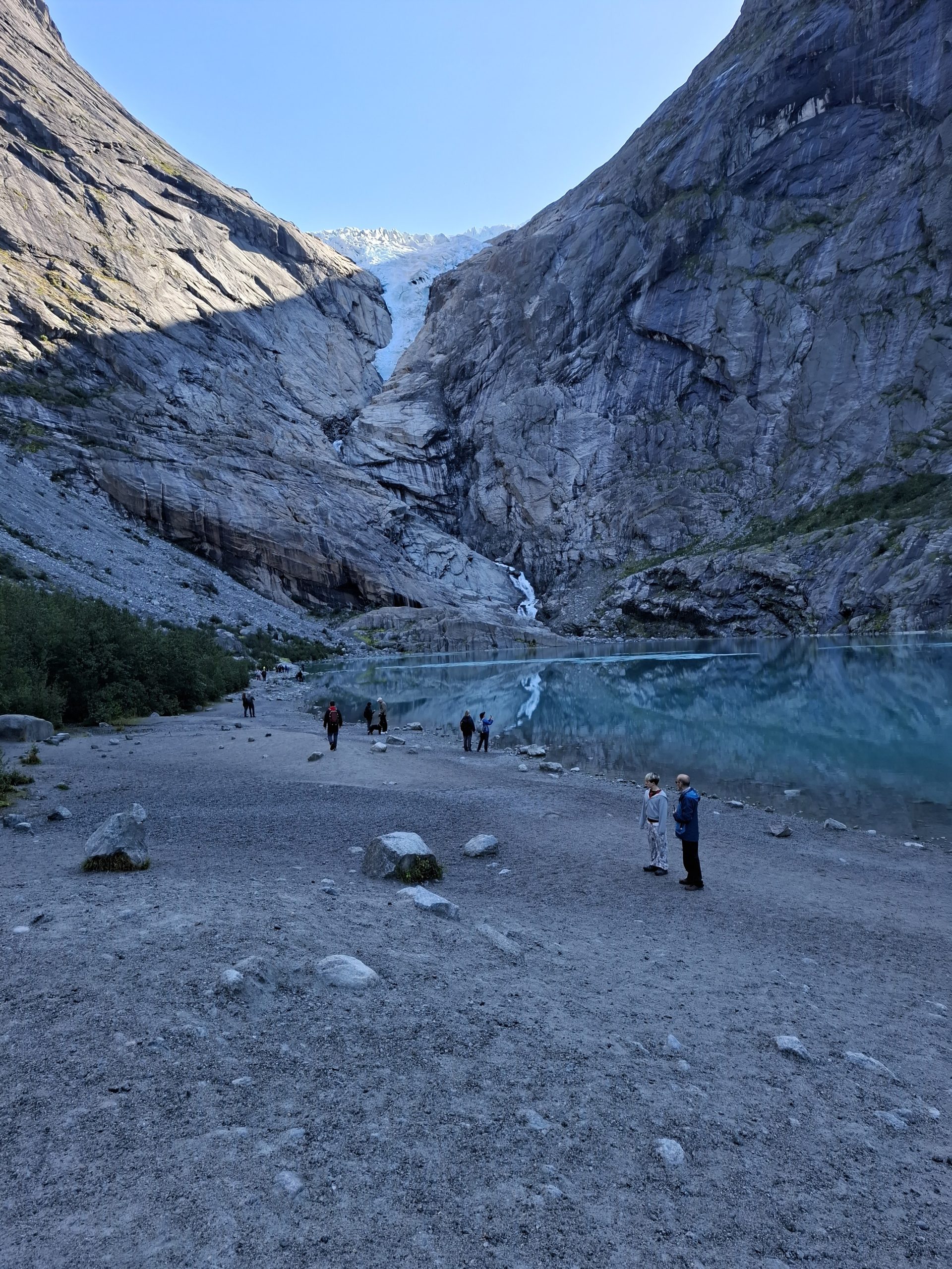 We arrived at the base of Briksdal Glacier at around 11.00 and were given 90 minutes to hike to the base of the glacier (about 40 mins) and return (about 20 mins) for the faster walkers. The hike included some steep sections and Tania had to wait a few times for Graeme to catch his breath. On the way, there were sign posts showing where the face of the glacier had been for the last 200 or so years. It is amazing just how far it has regressed in that short time. There is a continual stream of chilly melt water coming down off the Glacier.