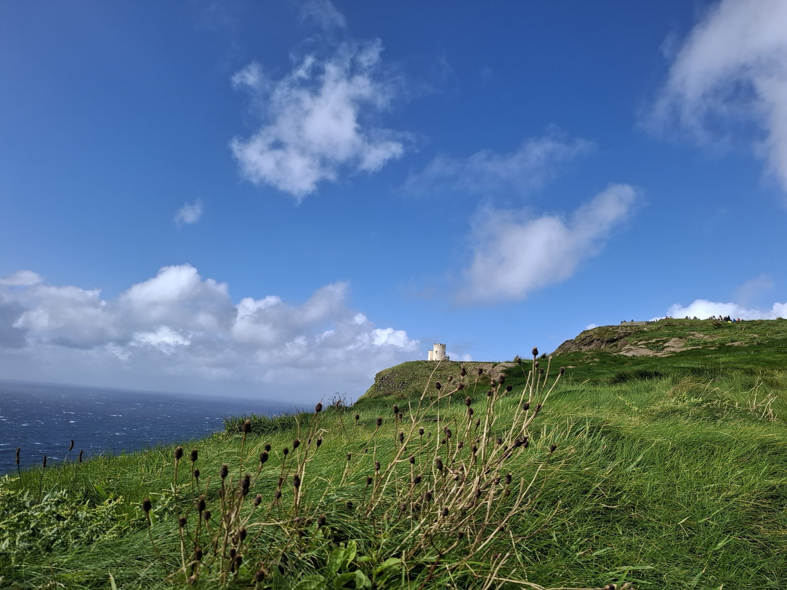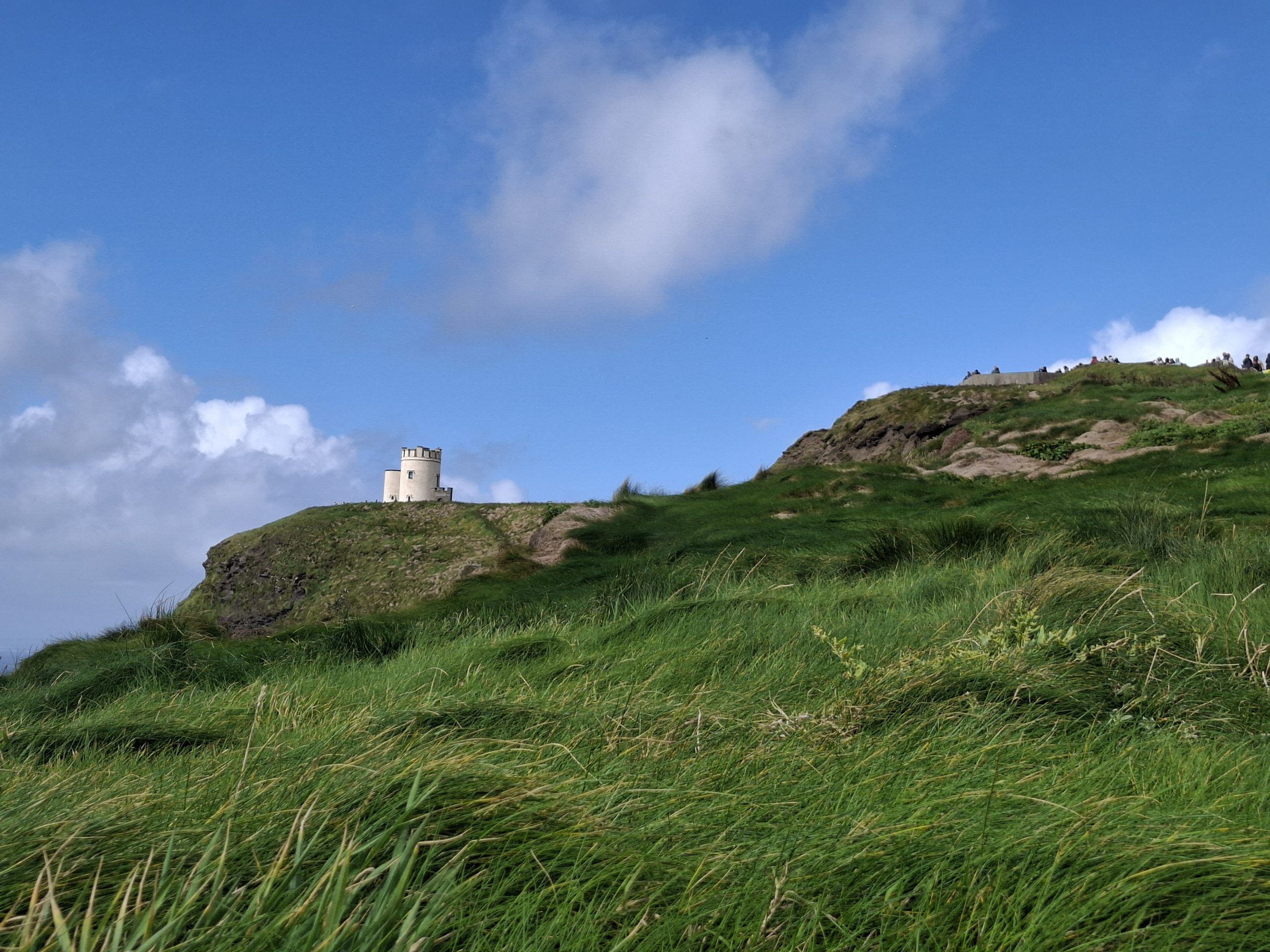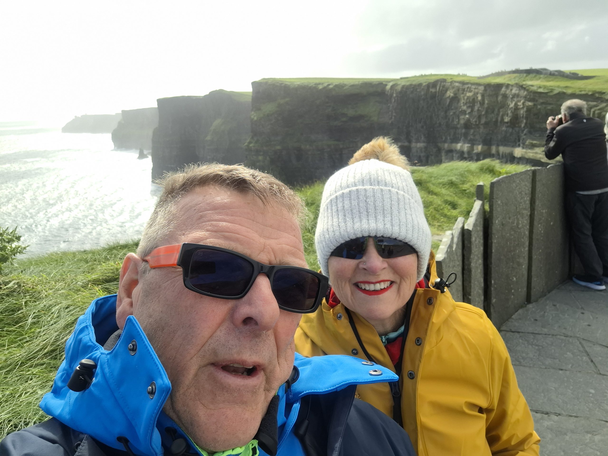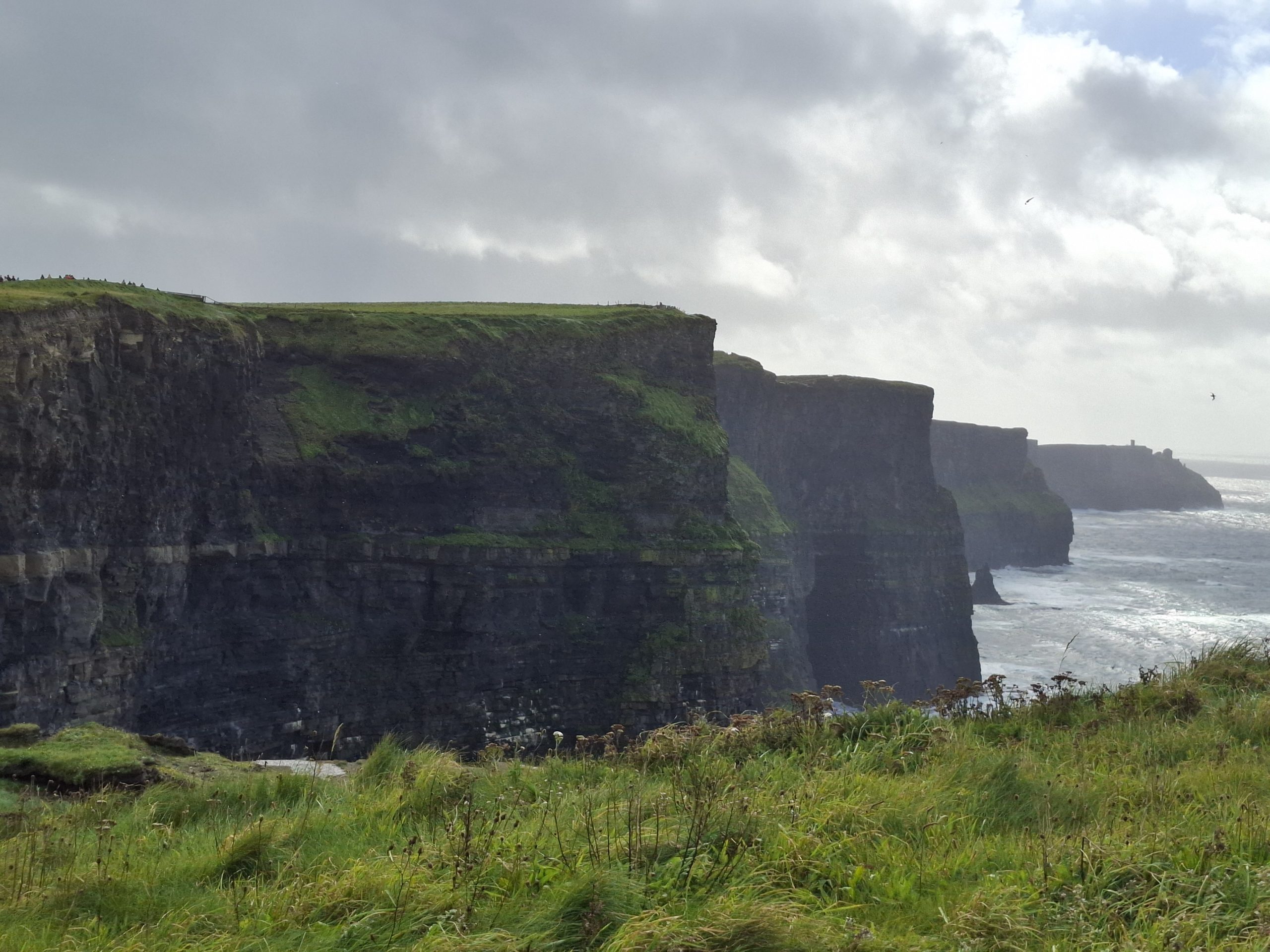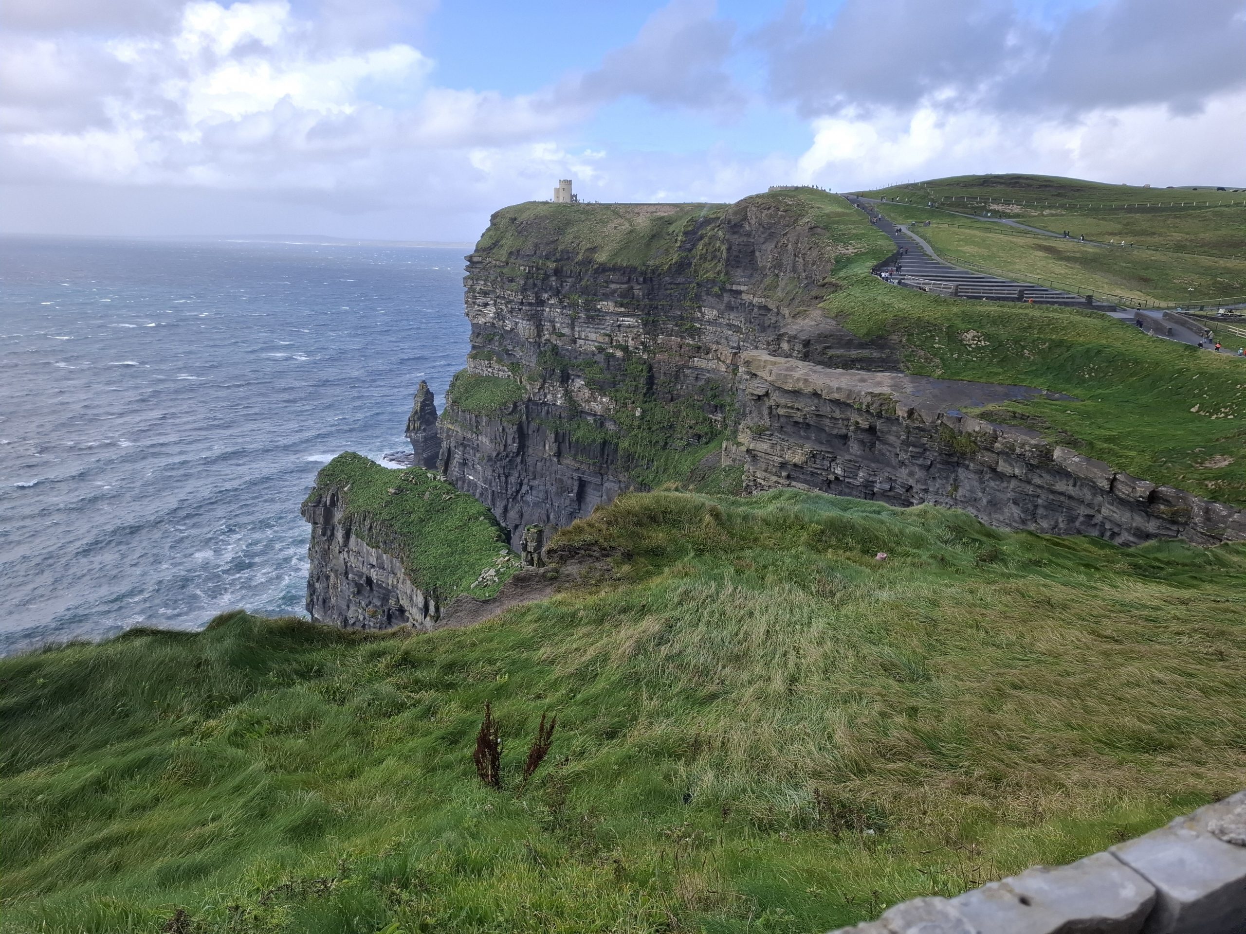 Another cave ticked off on our growing list. After a coffee, we left at around 14:50 and the weather was still average with waves of rain going over us. We drove through Doolin village and decided not to stop, and Graeme googled for free viewing places for the Cliffs of Moher. He thought he found one at the North side of the cliffs, but when we got there it was in fact the main visitor centre. We bit the bullet, paid for our entry and car park and set off to view the cliffs, after all this is the most visited outdoor tourist location in Ireland.