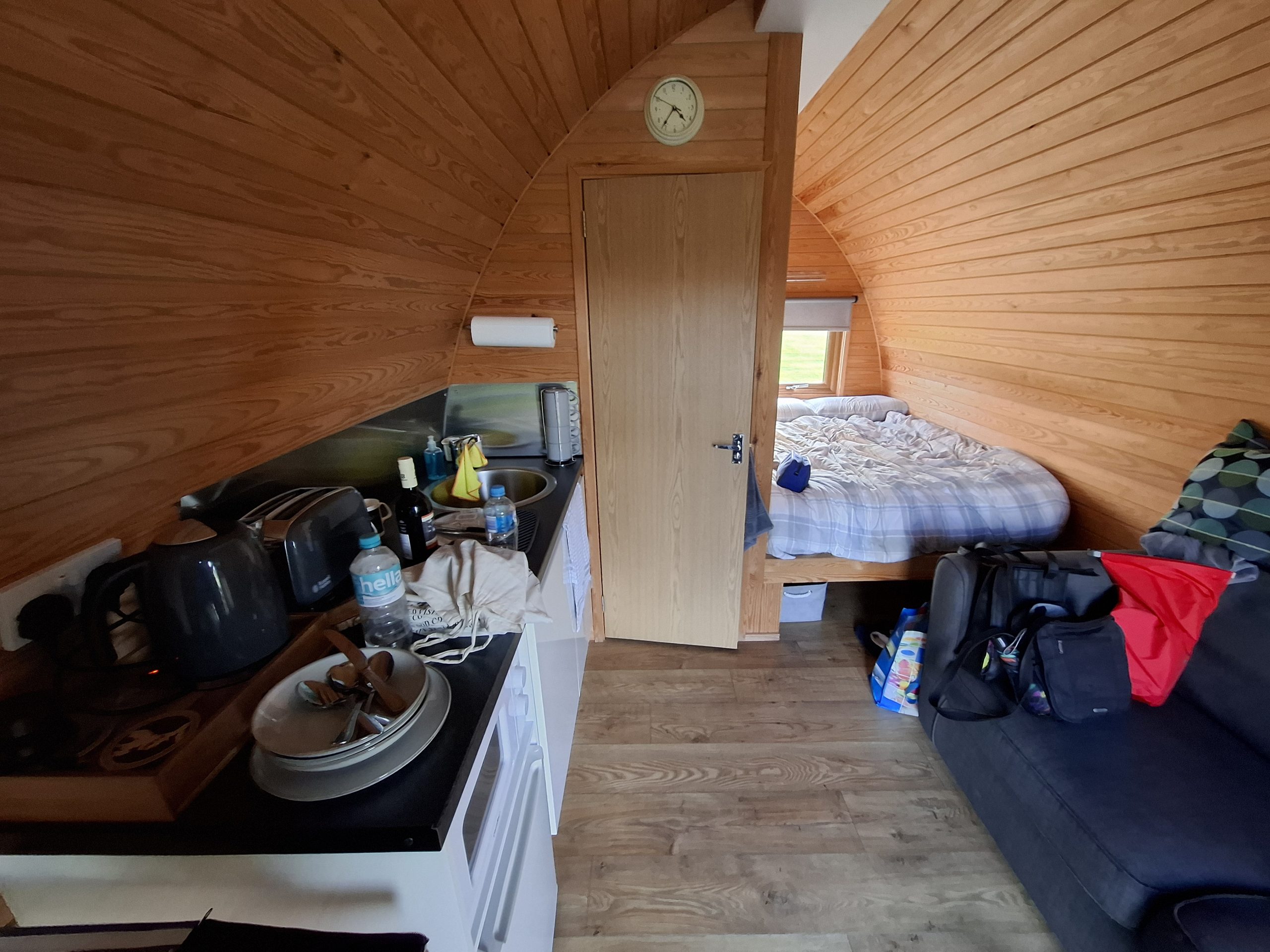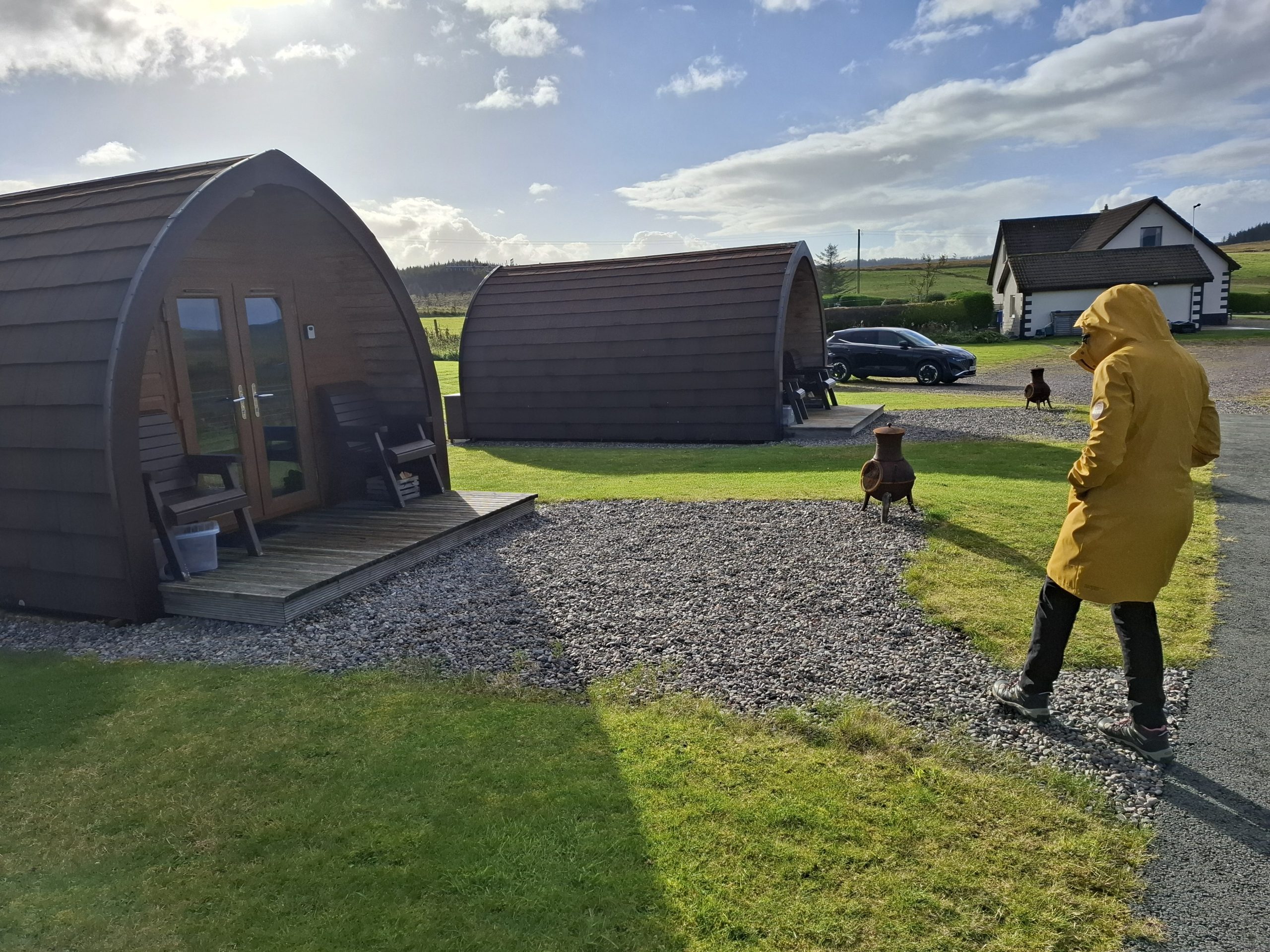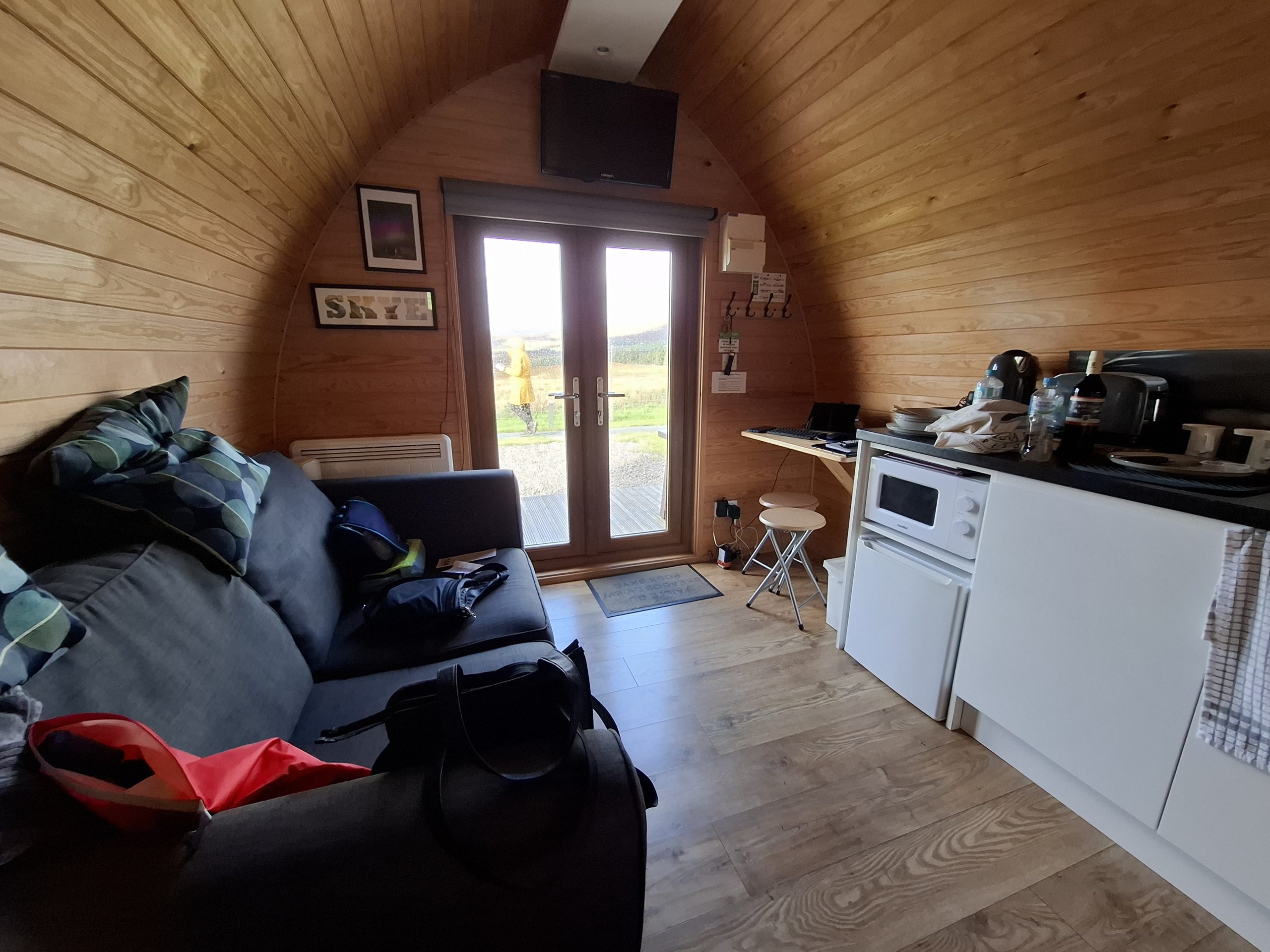 We arrived back in Fort William just after 15:45, visited the nearby supermarket for some supplies for dinner, and set the GPS for our next stop on the Isle of Skye - a 3 hour drive on winding roads around lochs and steep hills ! After a relatively fine weather day, as we approached Skye the clouds started to roll in with rain ! Arrived around 19:00 and settled into our rural stay in a very comfortable and compact pod.