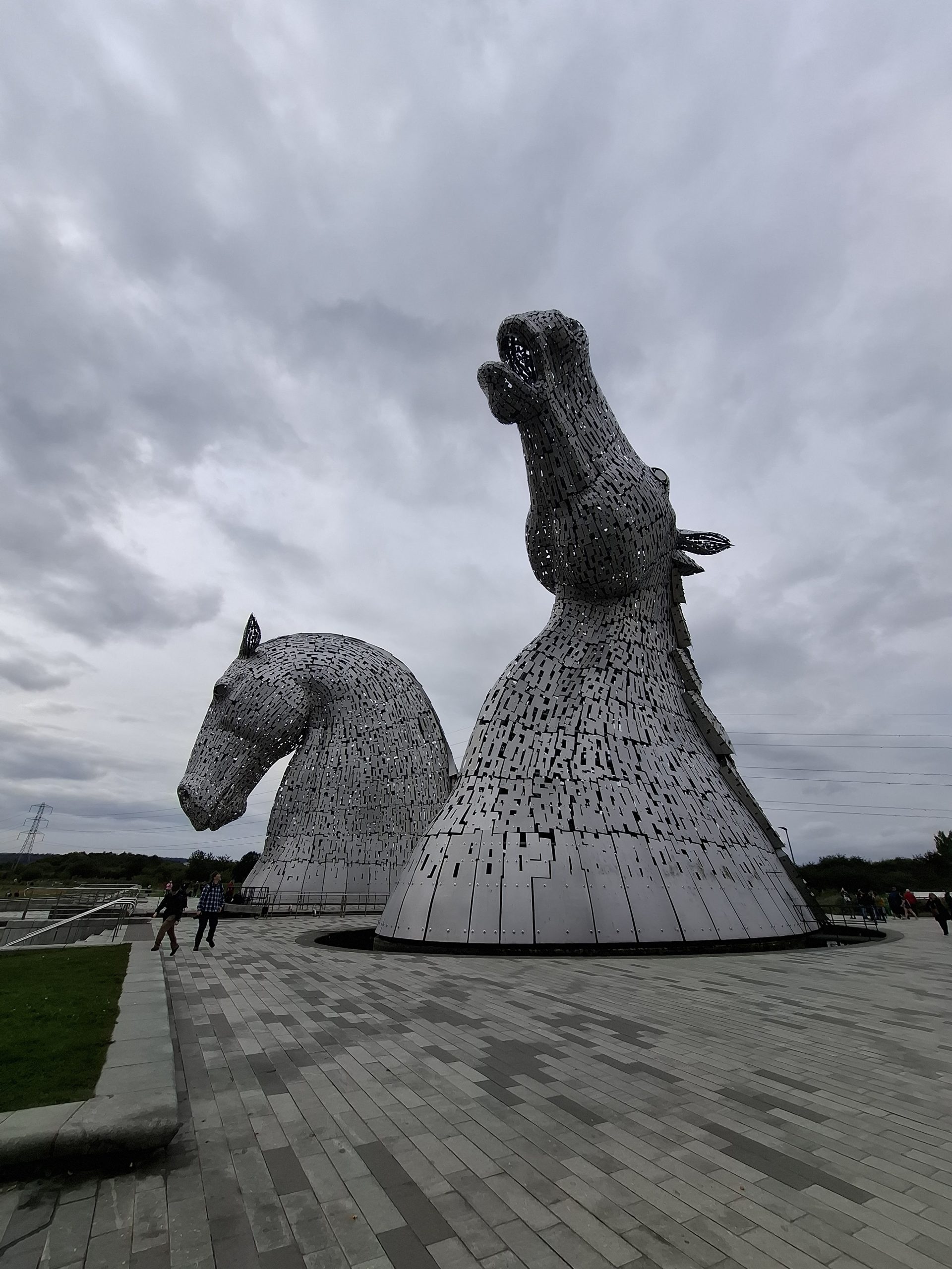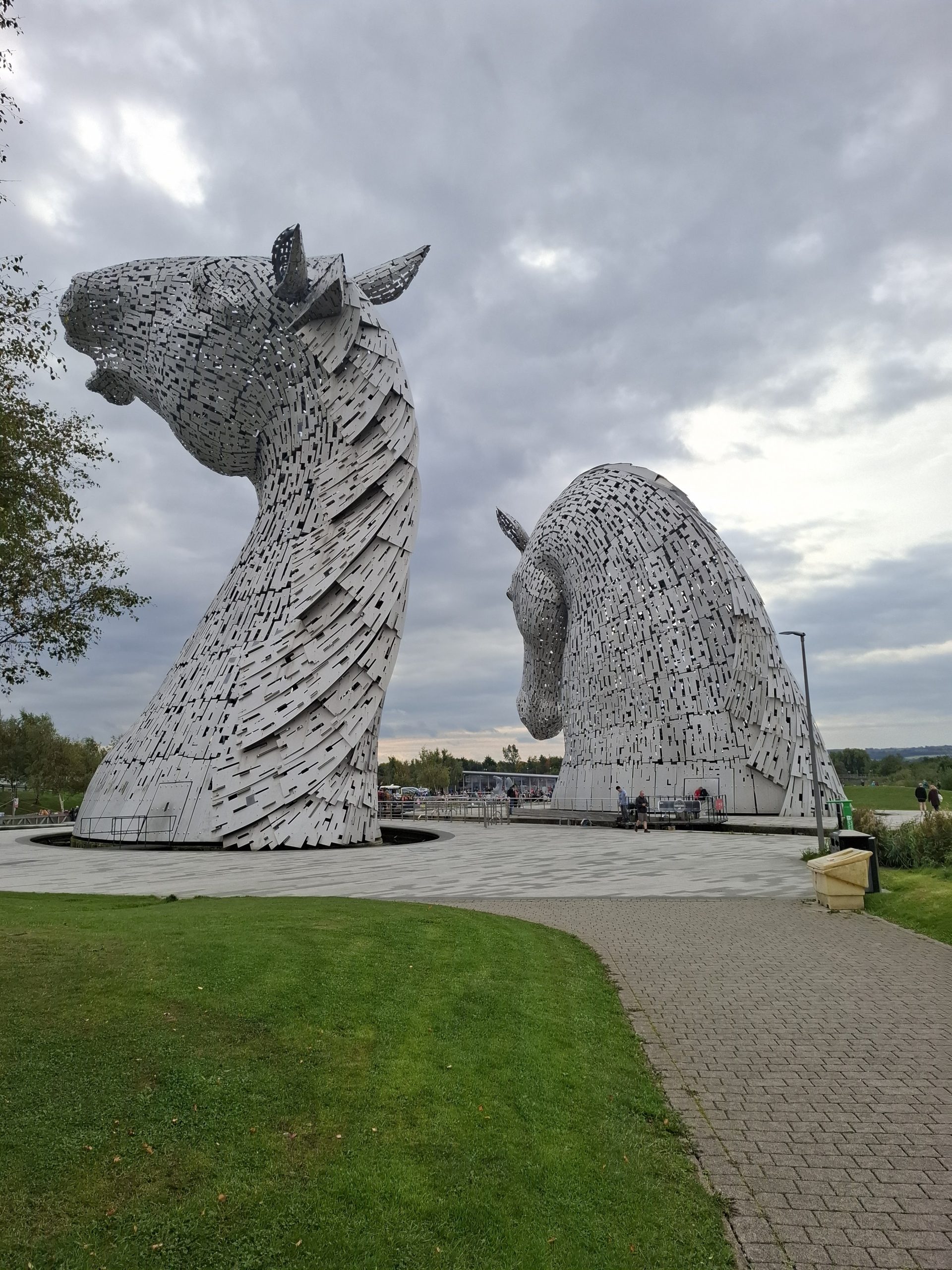 "The Kelpies are large horse-headed sculptures in Scotland that represent both mythological shape-shifting water spirits and the heavy horses that powered industry and transport. In folklore, kelpies are dangerous, equine-formed spirits that lure people to a watery grave. The 30-meter-high steel sculptures, designed by Andy Scott, commemorate the vital role of heavy horses in Scotland's industrial past, particularly their work hauling barges along the Forth and Clyde Canal, where the sculptures are now located. These were modelled after two real-life Clydesdale horses named Duke and Baron".